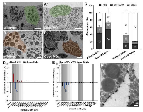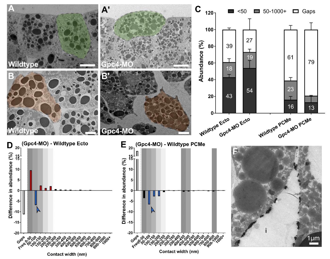 Supplementary figure 6. Glypican-4 knockdown affects cell contact patterns. TEM images of (A-A’) ectoderm and (B-B’) prechordal mesoderm of wildtype (A, B) and Gpc-4 morphants (A’, B’). (C) Abundance of narrow and wide contacts and gaps. Error bars represent standard deviation of the mean. For p values refer to datasets S2 and S3. (D, E) Difference spectra of Gpc- 4 morphant ectoderm and prechordal mesoderm. The left-most, empty column denotes gaps. Blue arrowhead highlights reduction in 50-100nm contacts. Gray shading indicates peaks in wildtype spectra. Colored bars represent statistically significant changes (p<0.05) in abundance that is ≥ 50% in morphants compared to wildtype (blue, decrease, red, increase). (F) TEM image of La3+ stained Gpc-4-MO mesoderm with patches of glycocalyx in gaps (i) and contacts (top). n = 24 embryos (wildtype), 12 (Gpc-4-MO). Scale bars (A-B’), 10 μm. |