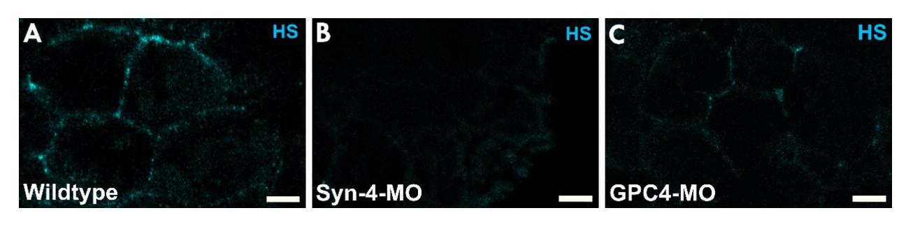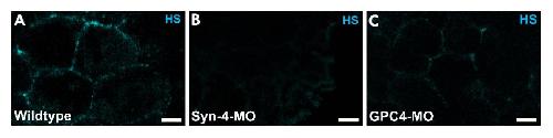 Supplementary figure 7. Heparan sulfate (HS) staining. HS antibody staining of (A) wildtype, (B) Syn-4, and (C) Gpc-4 morphant prechordal mesoderm. Scale bars, 15 μm. |
