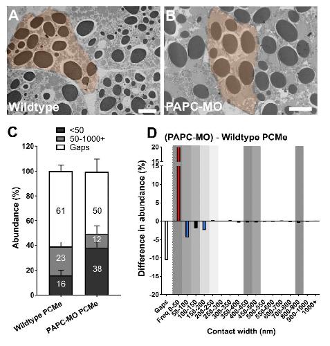 Supplementary figure 8. Paraxial protocadherin (PAPC) affects contact patterning in prechordal mesoderm. TEM images of a region of prechordal mesoderm in (A) wildtype and (B) PAPC morphants. (C) Summary of the abundance of narrow and wide contacts and of gaps. Error bars represent standard deviation of the mean. For specific p values, please refer to dataset S3. (D) Difference spectra of PAPC morphant prechordal mesoderm. The left-most, empty column denotes gaps. Gray shaded areas correspond to peaks in wildtype contact spectra. Colored bars represent statistically significant changes (p<0.05) in abundance values that are ≥ 50% in morphants compared to wildtype (blue, decrease, red, increase). n = 24 embryos (wildtype), 10 (PAPC-MO). Scale bars, 10 μm. |