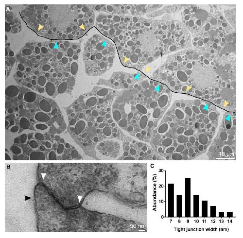 Supplementary figure 11. Measurement of contacts and gaps. (A) TEM image of a region of the prechordal mesoderm. Contact widths were measured along non-overlapping lines between cells like the one shown, and the lengths of contact categories (cyan arrowheads) and gaps (yellow arrowheads) along the lengths of these lines were determined. (B) TEM image of a tight junction in the epithelial layer of a wildtype Xenopus gastrula. Black arrowhead indicates the apical surface of the cell, white arrowheads the ends of a tight junction. (C) Tight junction width distribution in the wildtype gastrula. n = 22 tight junctions. |