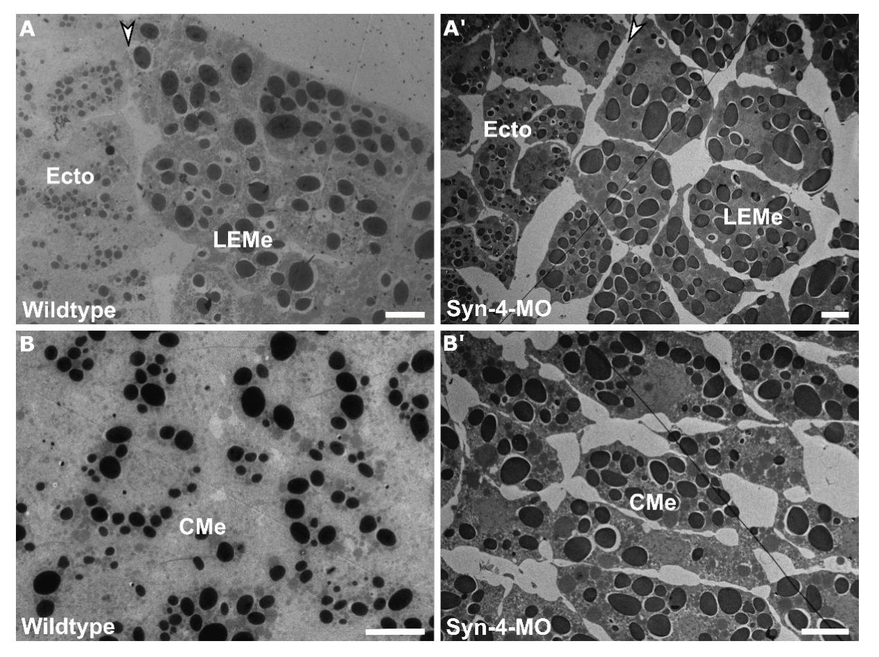 Supplementary figure 5. Cell shape in Syn-4 morphants. TEM images of wildtype (A, B) and morphant (A’, B’) ectoderm (Ecto) (A, A’), leading edge mesendoderm (LEMe) (A, A’) and chordamesoderm (B, B’). White arrowhead indicates the boundary between ectoderm and mesoderm. Scale bars, 10 μm. |