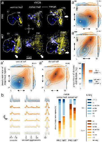 Fig. 3 Segregated odorant processing streams in the vMOB remain stable during metamorphic remodeling. (a) Maximum intensity projections of difference maps showing the increase in fluorescence signal after application of the odorant mixture (including amino acids, amines and bile acids; blue) and forskolin (yellow). The ventral (left) and dorsal (middle) halves of the vMOB of a prometamorphic (stage 57, above) and a metamorphic animal (stage 59, below) are shown. The two images to the right show the merged ventral and dorsal halves of the depicted vMOBs. White solid and dotted lines indicate the outline of ORN axonal projections of the ventral and dorsal halves, respectively. Segregation into a ventro-lateral forskolin-independent odorant processing stream and a medio-dorsal forskolin-dependent stream is visible. (aââaââââ) Positions of responsive regions along the anteriorâposterior and lateral-medial axes were measured and the probability density along those axes was estimated. Regions responding to odorants but not to forskolin (fsk-) are shown in blue, regions responding either to odorants and forskolin or only forskolin in orange (fskâ+). The 2D positional data of responsive regions of 11 vMOB hemispheres (nPROâ=â6, nMETâ=â5) from 8 different animals (nPROâ=â4, nMETâ=â4) was compared. First, between the ventral halves (aâ) and dorsal halves (aââ) of the vMOB as well as between prometamorphic (aâââ) and metamorphic animals (aââââ). White and black crosses indicate the peaks of the density estimates for the fsk-/fskâ+âprocessing streams, respectively. Each contour-level corresponds to an iso-proportion of the density distributions (20% of the distribution for each level). The distributions in each plot were normalized to the number of responding regions. Margin plots show the positions of individual responsive regions and their estimated density distribution along the respective axis. The responding regions belonging to the two streams show different distributions in all four plots, with the odorant positive/forskolin negative group located laterally and posteriorly and forskolin-responsive regions located medially and anteriorly. (b) Changes of the fluorescence signal of responding regions upon odorant/forskolin stimulations over time in seconds are shown. Fluorescence changes of individual time traces are presented as percentages of the maximum fluorescence of this region (%). Black lines in the background are time traces of all individual responsive regions belonging to a specific tuning profile. Colored lines represent the average traces of each tuning profile. The six most frequent response profiles are shown. Regions are tuned to amino acids, amines, or bile acids individually or in different combinations and either responsive or non-responsive to forskolin. Stacked bar plots show the percent share of individual tuning profiles among all identified responsive regions (nâ=â270) in the ventral and dorsal half of the vMOB in prometamorphic and metamorphic animals (ventral: nProâ=â110, nMETâ=â73; dorsal: nPROâ=â31, nMETâ=â56). Blue shaded profiles are forskolin-non-responsive (nâ=â111), yellow/orange profiles are forskolin-responsive (nâ=â159). A anterior, AA amino acids, AM amines, BA bile acids, FSK forskolin, L lateral, M medial, MET metamorphosis proper, ON olfactory nerve, P posterior, PRO prometamorphosis, vMOB ventral main olfactory bulb |