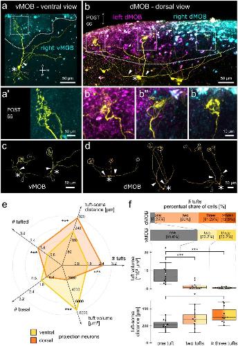 Fig. 6 Different morphology of projection neurons in the vMOB and dMOB of postmetamorphic Xenopus. ORN axonal projections from the olfactory epithelia (both PC and MC) were traced via electroporation of fluorophore-coupled dextrans (left: Cascade Blue dextran, magenta; right: Alexa Fluor 594 dextran, cyan), and projection neurons (yellow) with Alexa Fluor 488 dextran via sparse cell electroporation in the vMOB (a) and dMOB (b). White dotted lines indicate the ORN projections, tufts (white dotted squares in a, b) are shown in a higher magnification in (aâ) (vMOB), (bââbâââ) (dMOB). Reconstructions of representative neurons in the vMOB (c) and dMOB (d) are shown. Asterisks indicate the projection neuron somata, filled white arrowheads primary tufted dendritic branches and empty arrowheads primary basal neurites without tufted terminals. (e) Each radial axis on the radar chart represents a morphological descriptor of the projection neurons. The means of the descriptors of projection neurons in the vMOB (yellow; nâ=â18) and the dMOB (orange; nâ=â16) are shown. Dorsal projection neurons have a higher number of tufts, a longer average distance between soma and tufts and more primary tufted dendrites. Neurons in the vMOB have a significantly higher tuft volume. The number of primary basal neurites is similar between the groups. (f) The stacked barplots depict the percent share of uni-tufted (grey) and multi-tufted projection neurons (yellow, vMOB; orange, dMOB). A higher number of uni-tufted projection neurons was found in the vMOB (>â50%), whileâ>â90% of neurons in the dMOB terminated in at least two tufts, maximally in five tufts. Boxplots: Average tuft volumes (above) and average distance between tufts and somata (below) are compared between uni-tufted neurons (grey, left, nâ=â11), bi-tufted neurons (yellow/orange, middle, nâ=â12) and neurons with three or more tufts (dark yellow/dark orange, right, nâ=â11). White triangles depict the means. Tuft volume decreases with a higher number of tufts, while tuft-soma distance increases. The groups contain neurons from both the vMOB and the dMOB. *pâ<â0.05, **pâ<â0.01, ***pâ<â0.005. A anterior, dMOB dorsal main olfactory bulb, L lateral, M medial, ON olfactory nerve, P posterior, POST postmetamorphosis, vMOB ventral main olfactory bulb, PRE premetamorphosis, PRO prometamorphosis, MET metamorphosis proper, vMOB ventral main olfactory bulb |