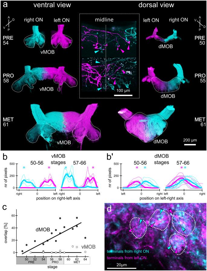 Fig. 5 During metamorphosis, ORN axons from the left and right olfactory epithelia form a single dMOB projection field with increasing bilateral innervation overlap. (a) Images of ORN axonal projections in the vMOB (left images, ventral view) and the dMOB (right images, dorsal view) in a pre-, pro-, and metamorphic animal. Projections from the left (magenta) and right (cyan) olfactory epithelia (both PC and MC) were traced with two different fluorophore-coupled dextran dyes (Alexa Fluor 488 and 594 dextrans) via electroporation. White dotted lines indicate the outlines of ORN axonal projections. While the left and right projections in the vMOB are clearly separated, the dMOB progressively fuses around the midline. The insert in the middle shows a close-up of sparsely labeled ORN axons crossing the midline (vertical dotted line) innervating contra- and ipsilateral glomeruli in the dMOB. (b, bâ) The number of pixels containing fluorescence signal from the ORN projections from the left (magenta) and right (cyan) were counted at each position along the leftâright axis, separately for the vMOB (b) and the dMOB (bâ). The thin lines represent individual animals and the bold lines the mean of all animals belonging to the two presented developmental groups (stages 50â56 and 57â66). The x-axis is scaled from the outermost right edge to the outermost left edge of axonal projections in the vMOB and mirrored around the midline in the dMOB, with 0 being the interhemispheric midline. In the vMOB (b), pixels around the midline did not contain fluorescence signal from ORN axons of either of the two epithelia, while in the dMOB (bâ), pixels around the midline contained signal from axons from the left and right epithelia. The asterisks highlight the position with the highest count of pixels containing signal of axons from the left (magenta) or right (cyan). The maxima are close to the midline in the dMOB of both developmental groups. (c) The overlapping volume of axonal projections from the left and the right relative to the entire ORN axonal projection volume was calculated for tadpoles of different developmental stages and separately for the vMOB (white dots) and the dMOB (black dots). While the vMOB projections have no overlapping volume, the innervation overlap in the dMOB increases during metamorphosis. A RANSAC regression line was fitted through the data. (d) A close-up of the projections around the midline in the dMOB shows that single glomerular structures get input from both left and right olfactory epithelia (indicated by the magenta and cyan arrowheads, respectively). A anterior, D dorsal, dMOB dorsal main olfactory bulb, MET metamorphosis proper, ON olfactory nerve, P posterior, PRE premetamorphosis, PRO prometamorphosis, V ventral, vMOB ventral main olfactory bulb |