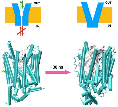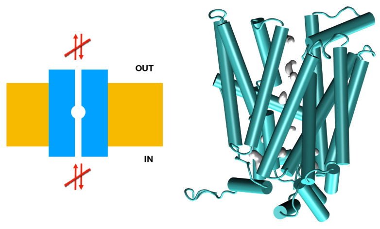 Figure 2. Mechanistic interpretation of the effects of the M126V mutation of SLC2A9b. The M126V model suggests that this mutation renders the vestibular regions unavailable. Left: schematic representation of the channel (in blue), membrane (yellow), and flow (arrows). Right: a snapshot of the M126V model during an MD trajectory, in cartoon representation in green. Internal space is represented by showing the solventâs accessible surface in gray.