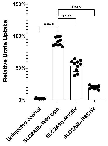 Figure 5. Met126Val mutation reduces uric acid uptake. Uric acid uptake assay was performed as described in the Methods section. M126V mutation in SLC2A9b reduced uric acid uptake by 45% and R351W mutation decreased by 70%. Histogram depicts relative urate uptake level (n = 10). Quantification with one-way ANOVA (Dunnett’s multiple comparisons test), **** p < 0.0001. Data represent the mean ± S.D. of three individual experiments. **** p < 0.0001.