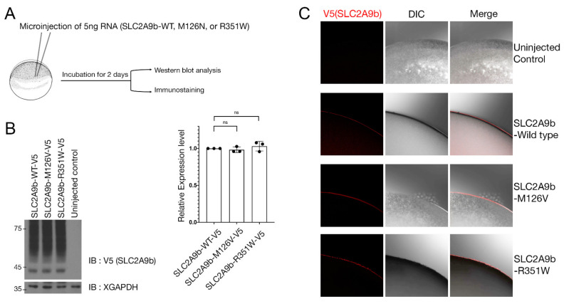 Figure 4. Expression of WT and mutant SLC2A9b in Xenopus oocytes. (A) Schematic representation of the experimental procedure. The same amount of wild-type or mutants SLC2A9b RNAs were injected into oocytes. The oocytes were harvested after 2 days and then, Western blot analysis or immunostaining was performed. (B) SLC2A9b wild type and mutants showed similar protein expression levels. The histogram depicts the relative protein expression level (n = 3). Quantification with one-way ANOVA (Dunnettâs multiple comparisons test), p = 0.4363. Data represent the mean ± S.D. of three individual experiments. ns: no statistical differences between the groups. (C) Immunostaining was performed using anti-V5 antibodies. Both WT and mutants SLC2A9b showed plasma membrane localization in Xenopus oocytes. DIC; differential interference contrast image.