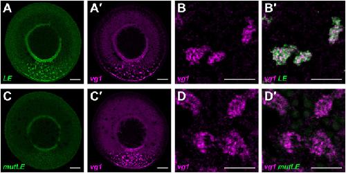 FIGURE 2:. Assembly into L-bodies is correlated with vegetal localization. (A) A cryosection of a stage II oocyte is shown, with microinjected fluorescently labeled LE RNA (green) and endogenous vg1 mRNA (A′) detected by FISH (magenta). The vegetal cortex at the bottom, and the scale bar = 50 µm. (B) High magnification view of the vegetal cytoplasm of a stage II oocyte with endogenous vg1 mRNA (magenta) detected by FISH and microinjected LE RNA (green) shown merged in B′. Scale bar = 10 µm. (C) A cryosection of a stage II oocyte is shown, with microinjected fluorescently labeled mutant LE RNA (mutLE) in green and endogenous vg1 mRNA (C′) detected by FISH in magenta. The vegetal cortex at the bottom and the scale bar = 50 µm. (D) High magnification view of the vegetal cytoplasm of a stage II oocyte with endogenous vg1 mRNA (magenta) detected by FISH and microinjected mutLE RNA (green) shown merged in D′. Scale bar = 10 µm. |