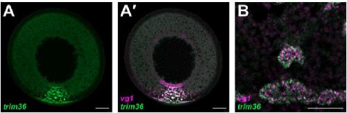 Figure S1. Trim36 mRNA is enriched in L-bodies. Trim36 mRNA (Cuykendall and Houston, 2009), which is transported to the vegetal hemisphere during stages II-II of oogenesis, is contained in L-bodies. (A) A cryosection of a stage II oocyte probed by FISH for trim36 mRNA (green), shown merged in A¢ with vg1 mRNA (magenta) is shown. The vegetal cortex at the bottom. Scale bar=50 μm. (B) Higher magnification view of trim36 mRNA (green) and vg1 mRNA (magenta) in the vegetal cytoplasm of a stage II oocyte. The vegetal cortex is at the bottom; scale bar=10 μm. |