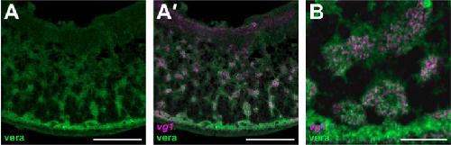 Figure S2. Vera protein is enriched in L-bodies. (A) Combined FISH-IF was used to detect vera protein (A, green) in the vegetal cytoplasm of a stage II oocyte, merged with vg1 mRNA (magenta) in A¢. The vegetal cortex is at the bottom; scale bar=50 μm. (B) High magnification view of the vegetal cytoplasm of a stage II oocyte showing colocalization of vg1 mRNA (magenta) and vera protein (green). Scale bar=10 μm. |
