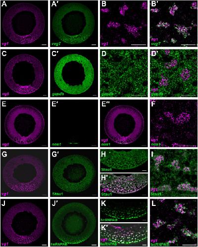 FIGURE 1: Vegetally localizing mRNA is contained in a large RNP complex. (A) A cryosection of a stage II oocyte probed by FISH for vg1 mRNA (magenta) and vegT mRNA (Aâ², green) is shown, with the vegetal cortex at the bottom. Scale bar = 50 µm. (B) Higher magnification view of the vegetal cytoplasm of a stage II oocyte probed by FISH for vg1 mRNA (magenta), shown merged in Bâ² with vegT mRNA (green). Scale bar = 10 µm. (C) A cryosection of a stage II oocyte probed by FISH for vg1 mRNA (magenta) and gapdh mRNA (Câ², green) is shown, with the vegetal cortex at the bottom. Scale bar = 50 µm. (D) Higher magnification view of gapdh mRNA in the vegetal cytoplasm of a stage II oocyte probed by FISH for gapdh mRNA (green), shown merged in Dâ² with vg1 mRNA (magenta). Scale bar = 10 µm. (E) A cryosection of a stage II oocyte probed by FISH for vg1 mRNA (magenta) nos1 mRNA (Eâ², green), and merged in Eâ²â² is shown. The vegetal cortex is at the bottom. Scale bar = 50 µm. (F) Higher magnification view of nos1 mRNA (green) and vg1 mRNA (magenta) in the vegetal cytoplasm of a stage II oocyte. The vegetal cortex is at the bottom; scale bar = 10 µm. (G) A cryosection of a stage II oocyte is shown, with the vegetal cortex at the bottom. Combined FISH-IF was used to detect vg1 mRNA (magenta) and Stau1 protein (Gâ², green). Scale bar = 50 µm. (H) Combined FISH-IF was used to detect Stau1 (H, green) in the vegetal cytoplasm of a stage II oocyte, merged with vg1 mRNA (magenta) in Hâ². Scale bar = 20 µm. (I) High magnification view of the vegetal cytoplasm of a stage II oocyte showing colocalization of vg1 mRNA (magenta) and Stau1 protein (green). Scale bar = 10 µm. (J) A cryosection of a stage II oocyte is shown with the vegetal cortex at the bottom. Combined FISH-IF was used to detect vg1 mRNA (magenta) and hnRNPAB protein (Jâ², green). Scale bar = 50 µm. (K) Combined FISH-IF was used to detect hnRNPAB (K, green) in the vegetal cytoplasm of a stage II oocyte, merged with vg1 mRNA (magenta) in Kâ². Scale bar = 20 µm. (L) High magnification view of the vegetal cytoplasm of a stage II oocyte showing colocalization of vg1 mRNA (magenta) and hnRNPAB protein (green). Scale bar = 10 µm. |