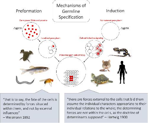 Figure 1. Schematic depicting the two major mechanisms of germline differentiation, preformation and induction. In preformative species, as shown on left, maternally derived germline determinants, also known as germ plasm ribonucleoparticles (GP-RNPs), are already present in the zygote and subsequently localize in a subset of cells to confer germline fate. In inductive species, as shown on right, no maternally derived germline determinants are present in the zygote, and primordial germ cells gain their identity later in embryonic development through cellâcell signaling. The lower quotes represent opposing 19th century-ideologies, from which the terms preformation and epigenesis (induction) were historically associated. |