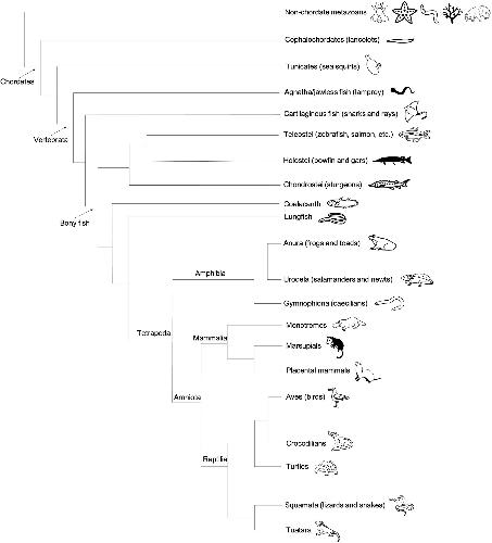 Figure 7. Cladogram depicting the general evolutionary relationships between major vertebrate classes, invertebrate chordates (tunicates), and non-chordate metazoans. Animal graphics adapted from the Noun Project (https://thenounproject.com/) and available via CC-BY license. |