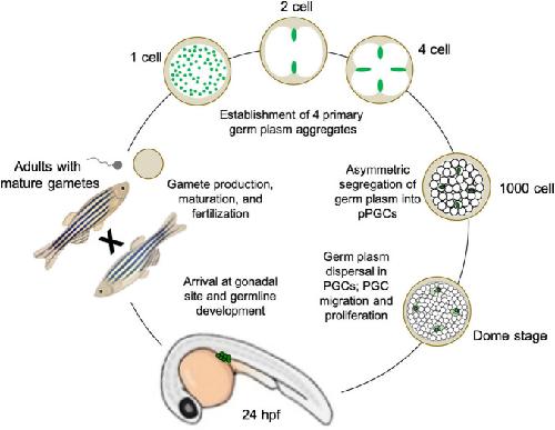 Figure 3. Illustration of germline determination cycle in the preformative model species Danio rerio (zebrafish), from maternally derived germ plasm dynamics during early embryogenesis to gamete maturation and reproduction during adulthood. |