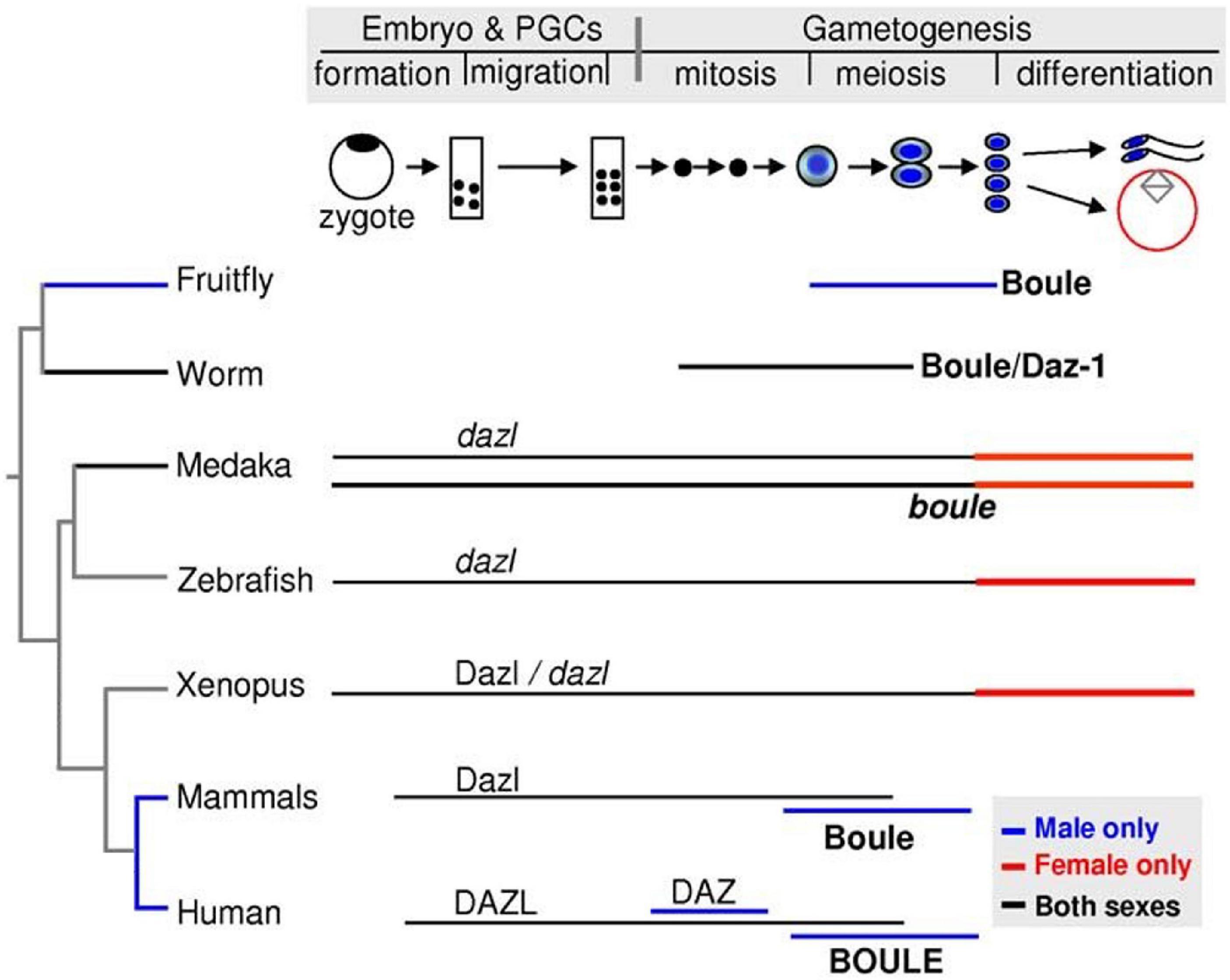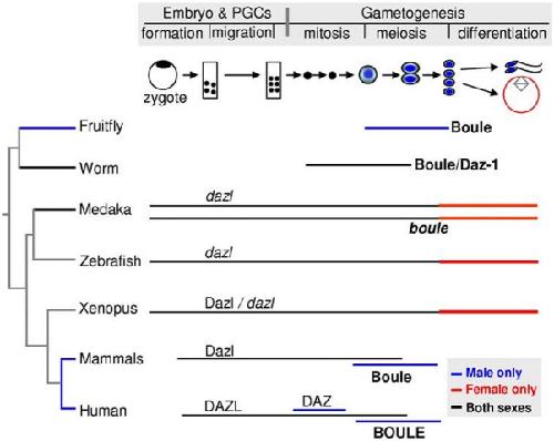 Xu, Boule is present in fish and bisexually expressed in adult and embryonic germ cells of medaka. 2009, Pubmed