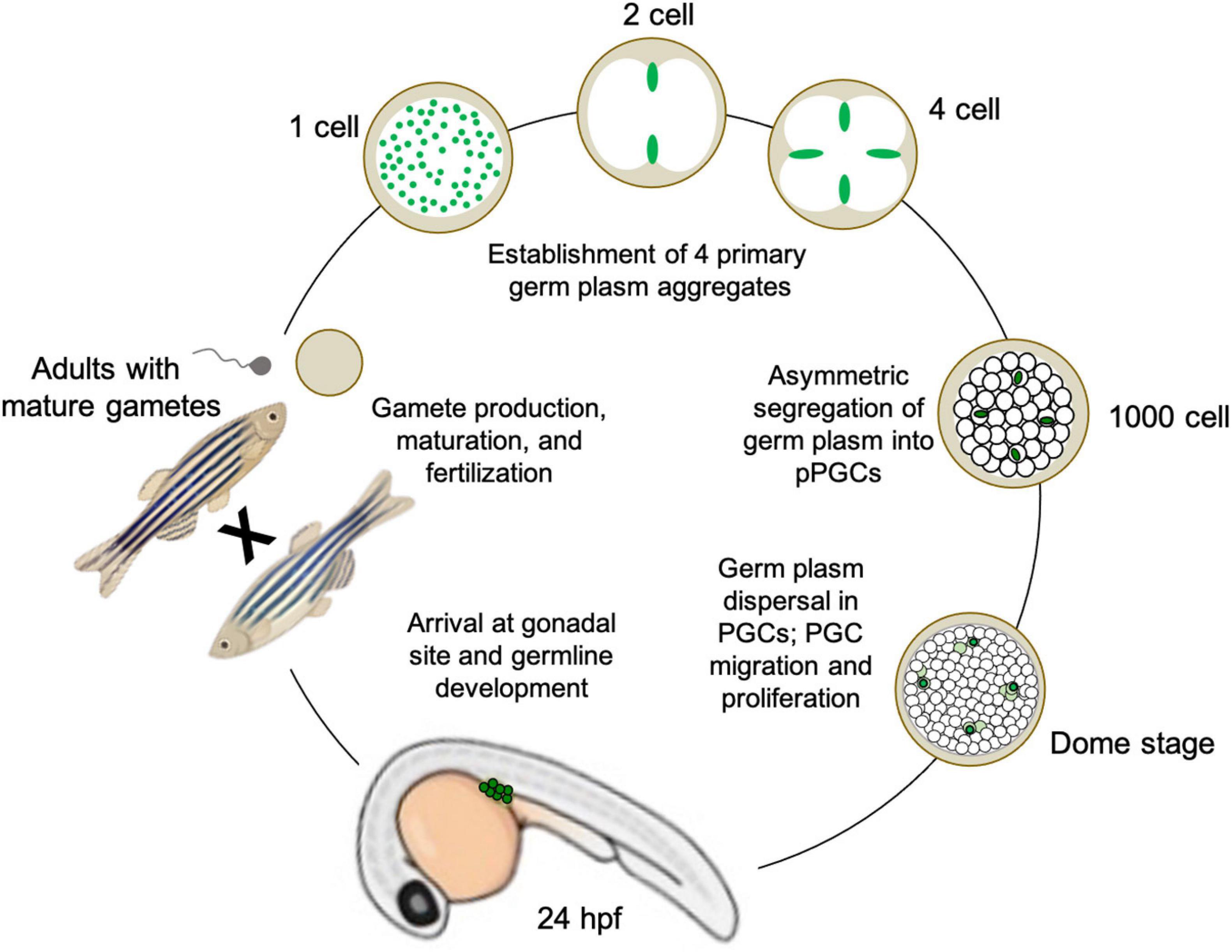 FIGURE 3. Illustration of germline determination cycle in the preformative model species Danio rerio (zebrafish), from maternally derived germ plasm dynamics during early embryogenesis to gamete maturation and reproduction during adulthood. |