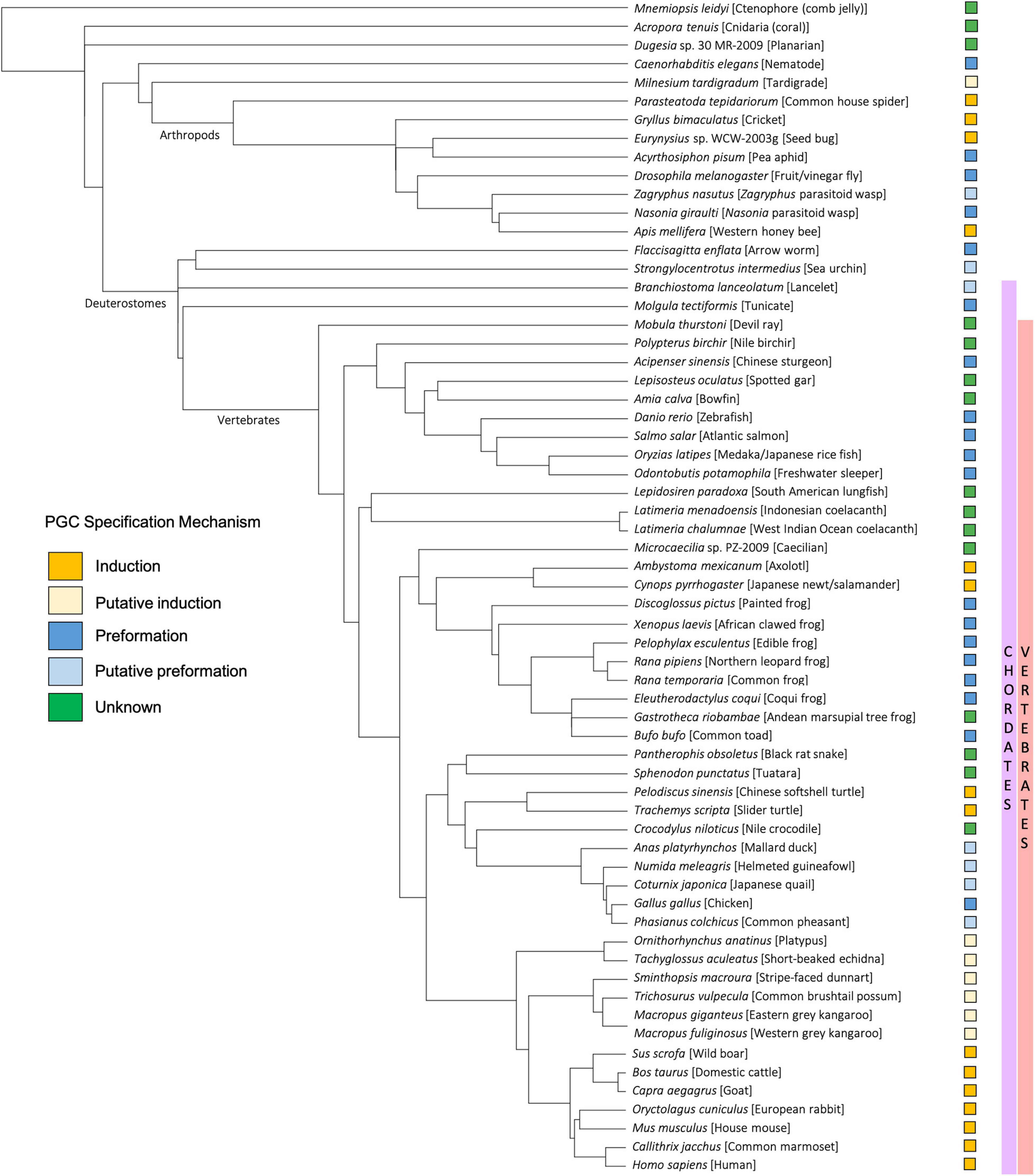 Figure 4. Taxonomic tree generated using the NCBI Common Tree Taxonomy Browser and Interactive Tree of Life (Letunic and Bork, 2021) to depict each species or clade referenced in this manuscript. Primordial germ cell (PGC) specification mechanism of each species is indicated according to key. |