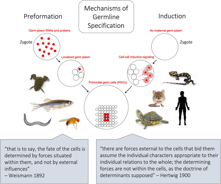 FIGURE 1. Schematic depicting the two major mechanisms of germline differentiation, preformation and induction. In preformative species, as shown on left, maternally derived germline determinants, also known as germ plasm ribonucleoparticles (GP-RNPs), are already present in the zygote and subsequently localize in a subset of cells to confer germline fate. In inductive species, as shown on right, no maternally derived germline determinants are present in the zygote, and primordial germ cells gain their identity later in embryonic development through cell–cell signaling. The lower quotes represent opposing 19th century-ideologies, from which the terms preformation and epigenesis (induction) were historically associated. |