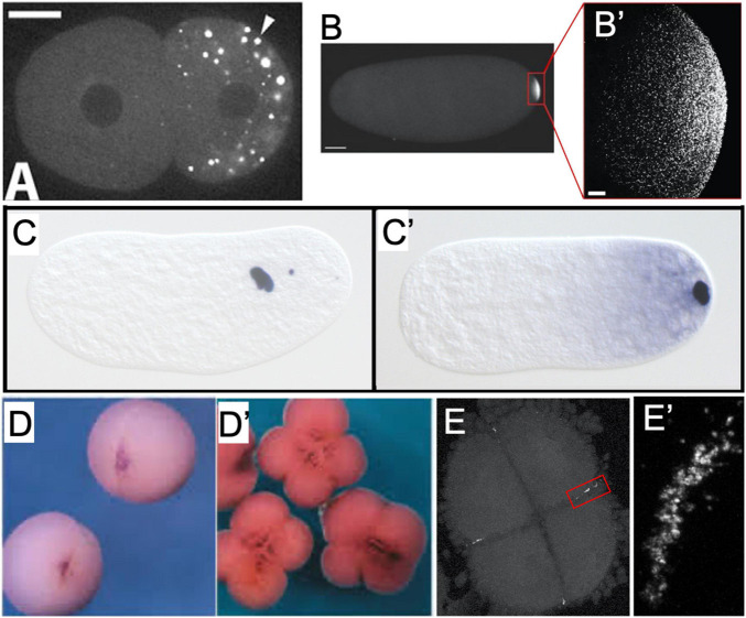 FIGURE 2. Examples of germ plasm morphology in several invertebrate and vertebrate species used for research about the preformative (maternal inheritance) mechanism of primordial germ cell specification. (A) PGL-1 protein-labeled P-granules in 2-cell C. elegans embryo. Adapted with permission from Spike et al. (2008). (B) Vasa protein-labeled pole plasm in a Drosophila embryo less than 1 h after egg laying, also magnified (B’) to show individual Vasa-positive germ granules that comprise the pole plasm. Adapted from Trcek et al. (2015) and available via CC-BY license. (C) Nasonia vitripennis wasp embryos in division cycle 2–3 and (C’) pre-syncytial blastoderm formation, labeled for the oosome component oskar RNA. Adapted from Lynch et al. (2011) and available via CC-BY license. (D) Vegetal view of germ plasm in albino Xenopus 2-cell and 4-cell (D’) embryos labeled for dazl RNA. Adapted with permission from Houston et al. (1998). (E) Zebrafish 4-cell embryo labeled for nanos RNA to show rod-like germ plasm masses at the cleavage furrow ends, also magnified (E’) to show structure of aggregated nanos germ plasm ribonucleoparticles. |