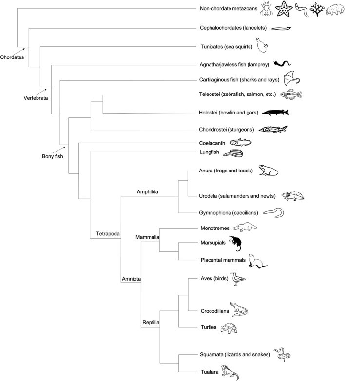 FIGURE 7. Cladogram depicting the general evolutionary relationships between major vertebrate classes, invertebrate chordates (tunicates), and non-chordate metazoans. Animal graphics adapted from the Noun Project (https://thenounproject.com/) and available via CC-BY license. |