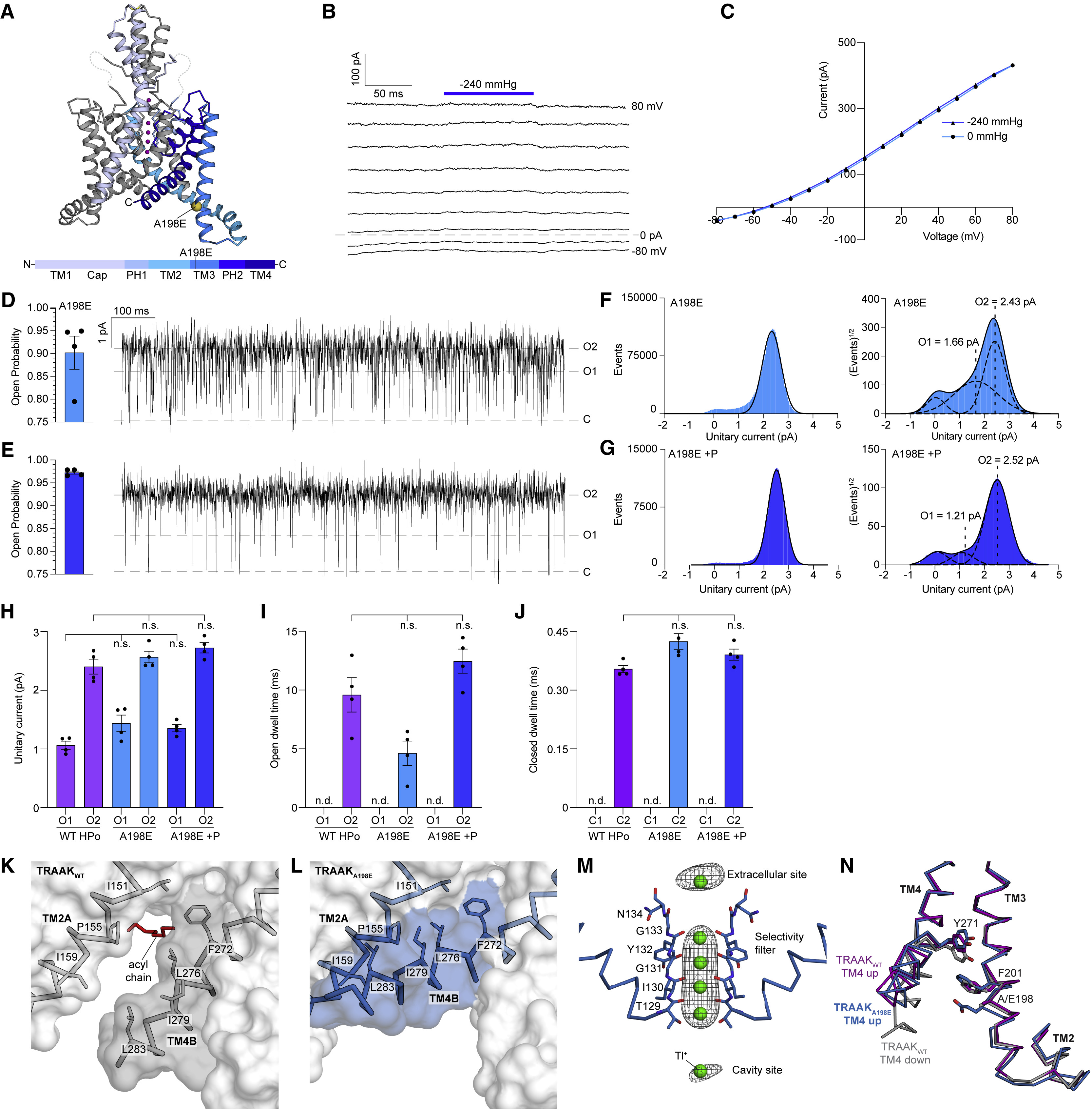 Figure 2. The FHEIG mutation TRAAKA198E promotes a long-duration, high-conductance TM4 up open state (A) Crystal structure of TRAAKA198E. Side view from the membrane plane with one protomer gray and the second protomer colored according to the key below. A198E is shown as a yellow sphere, and K+ ions are colored purple. (B) Macroscopic currents from a TRAAKA198E-containing patch in response to a voltage step protocol (Vhold = 0, Vtest = â80 to 80, ÎV = 10 mV, 20 mV intervals displayed) with a pressure step applied at each voltage (dark blue bar). (C) Current-voltage relationship from (B). (D and E) Open probability calculated from all (D) TRAAKA198E and (E) TRAAKA198E with pressure (+P) records (left, PO = 0.90 ± 0.04 and PO = 0.97 ± 0.003 [mean ± SEM, n = 4 patches]) and 1 s portion from representative recordings. (F and G) All event (left) and square root all event (right) current histograms from representative (F) TRAAKA198E and (G) TRAAKA198E+P recordings. (H) Unitary currents of TRAAKWT HPO, TRAAKA198E, and TRAAKA198E+P O1 and O2 states (1.07 ± 0.07 and 2.41 ± 0.13 pA, 1.44 ± 0.14 and 2.57 ± 0.10 pA, and 1.35 ± 0.06 and 2.72 ± 0.09 pA, respectively). (I) Open dwell times of TRAAKWT HPO, TRAAKA198E, and TRAAKA198E+P O2 states (9.60 ± 1.46 ms, 4.63 ± 1.03 ms, 12.46 ± 1.02 ms, respectively). (J) Closed dwell times of TRAAKWT HPO, TRAAKA198E, and TRAAKA198E+P C2 (0.35 ± 0.01 ms, 0.42 ± 0.02 ms, and 0.39 ± 0.01 ms, respectively). For (H)â(J), data are mean ± SEM, n = 4 patches; n.d., not determined; n.s., not significant (one-way ANOVA with Dunnett correction). (K) View of the membrane-facing lateral opening in a TRAAKWT TM4-down structure (PDB: 4WFF). A cavity-bound lipid acyl chain blocks conduction. (L) TRAAKA198E in the same view as (K). A TM4-up conformation seals the membrane opening. (M) Ions in a TRAAKA198E-Tl+ structure. Anomalous density (gray) around Tl+ ions (green) displayed at 2.5 Ï (extracellular/selectivity filter/cavity ions). (N) Overlay of the TM2-TM3-TM4 interaction from TRAAKA198E and TRAAKWT structures. A198E sterically and electrostatically promotes a TM4-up open state. See also Figures S1âS7 and Tables S1 and S2. |