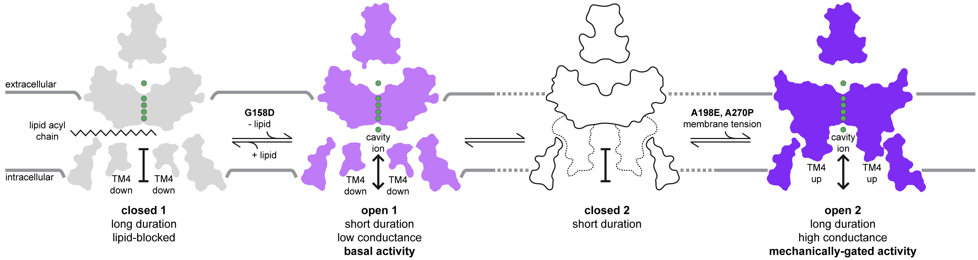Figure 5. An integrated model for TRAAK gating with distinct basal and mechanically gated open states Known structures are mapped to the linear four-state model for TRAAK gating. Basal activity corresponds to a TM4-down, low-conductance, short-duration open state O1. Mechanically gated activity corresponds to a TM4-up, high-conductance, long-duration open state O2. Long-duration closures correspond to a TM4-down lipid-blocked state C1. The unknown structure of the short-duration closed state C2 is drawn without ions, and the position of TM4 is indicated with dashed lines. |