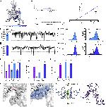 Figure 1. Distinct basal and mechanically activated open states in TRAAKWT (A) Macroscopic currents recorded across an inside-out patch pulled from a TRAAK-expressing cell in response to a voltage step protocol (Vhold = 0, Vtest = â80 to 80, ÎV = 10 mV, 20 mV intervals displayed) with a pressure step applied at each voltage (purple bar). (B) Current-voltage relationship from (A). (C) Open probability calculated from single-channel records (0.04 ± 0.02, 0.47 ± 0.07, and 0.96 ± 0.01 for low PO, mid PO, and high PO, respectively [mean ± SEM, n = 3, 4, and 4 patches]). All single-channel data in the paper were recorded at Vhold = 0 mV in a 10-fold gradient of [K+] and are presented in physiological convention. (DâF) 1 s portion from representative (D) low PO, (E) mid PO, and (F) high PO recordings, respectively. (GâI) All event (left) and open-only or square root all event (right) current histograms from representative (G) low PO, (H) mid PO, and (I) high PO recordings, respectively. (J) Unitary currents of O1 and O2 states (0.81 ± 0.03 pA and 1.80 ± 0.16 pA, 0.99 ± 0.03 pA and 2.14 ± 0.09 pA, and 1.07 ± 0.07 pA and 2.41 ± 0.13 pA for low PO, mid PO, and high PO recordings, respectively). (K) Open dwell time of O1 and O2 states (0.80 ± 0.15 ms, 0.91 ± 0.05 ms and 3.52 ± 0.51 ms, and 9.60 ± 1.46 ms for low PO, mid PO, and high PO recordings, respectively). (L) Closed dwell times of C1 and C2 states (28.70 ± 13.50 and 0.77 ± 0.03 ms, 3.59 ± 0.67 and 0.58 ± 0.05 ms, and 0.35 ± 0.01 ms for low PO, mid PO, and high PO recordings, respectively). For (J)â(L), data are mean ± SEM, n = 3, 4, and 4 patches; n.d., not determined; n.s., not significant; âââp = 0.0006, ââââp < 0.0001 (one-way ANOVA with Tukey correction). (M) Unitary current-open dwell time relationships for low PO, mid PO, and high PO open events and an overlay of low PO and high PO relationships at expanded timescale. Bubble size is proportional to percentage of open events. (N) Four-state TRAAK gating model. See also Figures S1âS5 and Table S1. |