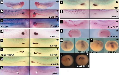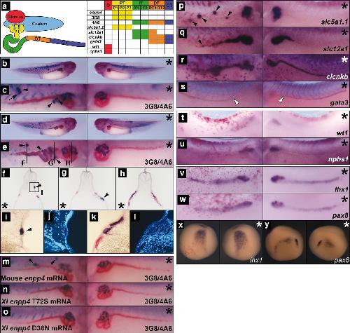 Fig. 2: MO knock-down of enpp4 expression disrupts pronephros formation. Embryos targeted with 10âng of enpp4 MO1 or 10âng of both enpp4 MOs (c, n) and 250âpg of lacZ mRNA were examined by 3G8/4A6 antibody staining (aâc) or whole-mount in situ hybridization with the following probes: slc5a1.1 (d), slc12a1 (e, f), clcnkb (g) and gata3 (h) at stage 37/38; wt1 (i) and nphs1 (j) at stage 33/34, lhx1 (kân) at stages 28, 24 and 14, pax8 (o) at stage 14. The embryo shown in (f) was co-injected with 2âng of mouse Enpp4 mRNA to rescue enpp4 knock-down phenotype. The asterisk denotes the control, uninjected side of each embryo. Blank arrowheads in (h) indicate the anterior limit of gata3 expression. See also Supplementary Table 2 for raw data and statistical analyses and Supplementary Figs. 2 and 3. |