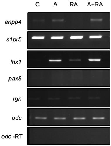 Supplementary Fig. 4. Enpp4 expressionis regulated by activin but not by retinoic acid in animal cap assay (related to Fig. 3). Animal cap were taken at blastula stage and cultured during 3 hours in the presence of activin (A), retinoic acid (RA) or activin + retinoic acid (A+RA) and total RNA extracted. RT-PCR was performed on treated and control (C) animal caps. The amplification of odc on samples with no reverse transcriptase (-RT) was carried out to control the purity of the RNAs. |