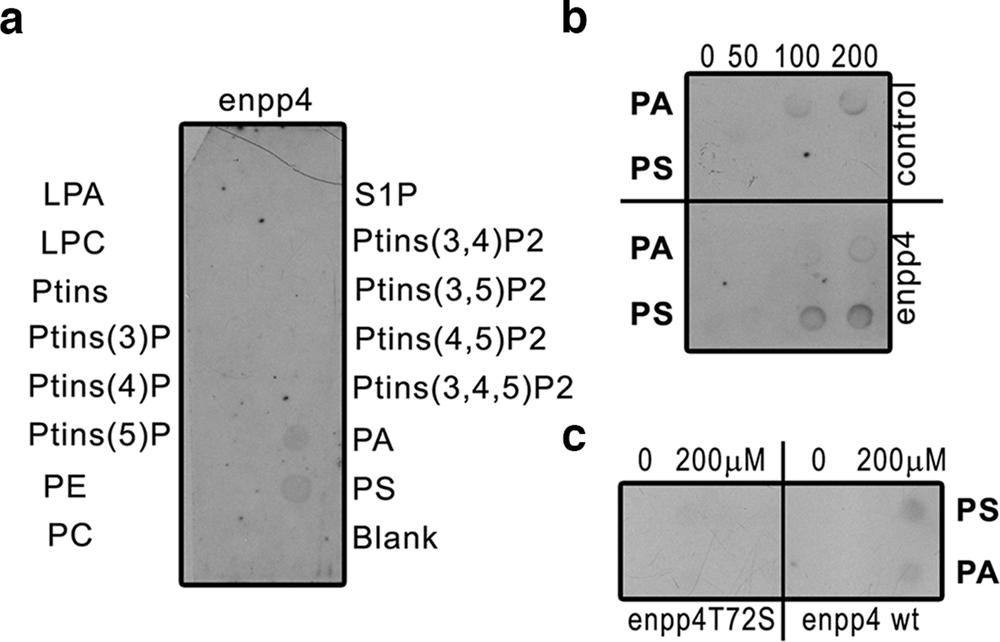 Fig. 7: Enpp4 specifically binds to the lysophospholipid, phosphatidylserine. a Membrane Lipid stripTM was incubated with membrane protein extracts from Enpp4 overexpressing CHO cells and the bound Enpp4 protein detected with anti-XlEnpp4 serum. b, c Nitrocellulose membranes were spotted with increasing amount of PA or PS and incubated with membrane protein extracts from CHO cells transfected with enpp4-pcDNA3.1, with enpp4T72S-pcDNA3.1 or empty plasmid (control) and the bound proteins detected with anti-XlEnpp4 serum. LPA lysophosphatidic acid, LPC lysophosphocholine, PA phosphatidic acid, PC phospatidylcholine, PE phosphatidylethanolamine, PS phosphatidylserine, PtIns phosphatidylinositol, S1P shingosine-1-phosphate (see also Supplementary Fig. 8). |