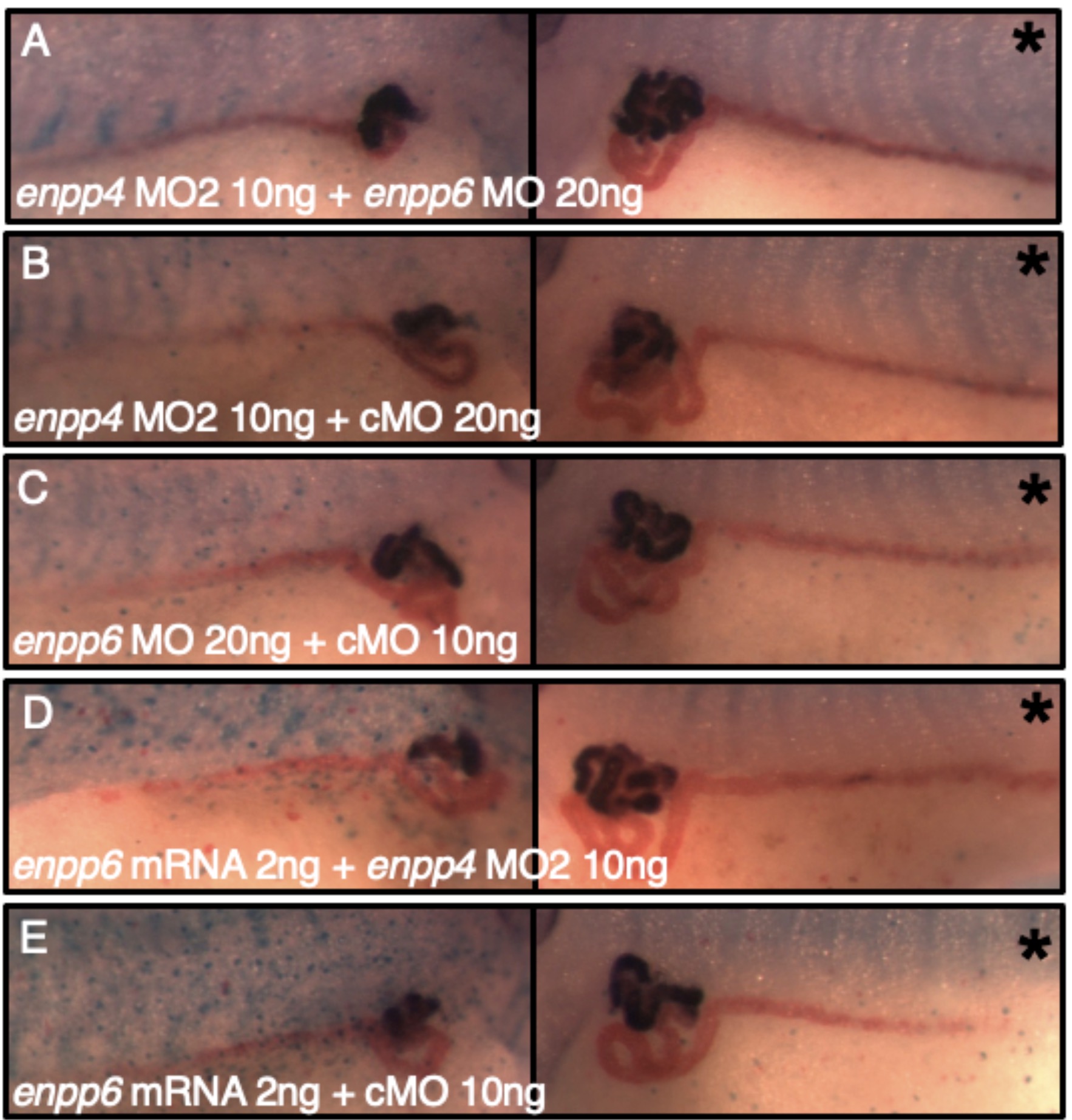 Supplementary Fig. 3. Phenotypes caused by the co-injection of the enpp4 and enpp6 MOs or enpp4 MO and enpp6 mRNA (related to Fig. 2). Injection of enpp6 mRNA, but not enpp6 MO, worsened the pronephric phenotypes caused by enpp4 knock-down. Injected embryos were analysed by 3G8/4A6 antibody staining at stage 41. (A) Embryo injected with 10 ng of enpp4 MO2 and 20 ng of enpp6 MO. (B) Embryo injected with 10 ng of enpp4 MO2 and 20 ng of control MO. (C) Embryo injected with 20 ng of enpp6 MO and 10 ng of control MO. (D) Embryo injected with 2 ng of enpp6 mRNA and 10 ng of enpp4 MO. (E) Embryo injected with 2 ng of enpp6 RNA and 10 ng of control MO. Asterisk denotes uninjected sides. The raw data and statistical analyses are provided in Supplementary Table 2. |