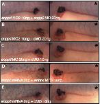 Supplementary Fig. 7. Expression profile of the sp1r5.S receptor gene, in vivo test of MO specificity and phenotypes caused by its knock-down (related to Fig. 6). (A) The s1pr5.S receptor displays a restricted expression profile in the adult frog and is expressed in the mesonephric tissue. Adult tissues were dissected and total RNAs from adult tissues were extracted using Trizol (Invitrogen) following the manufacturerâs protocol. RT- PCR was performed along with negative control. (B) The novel s1pr5.S receptor is expressed in the kidney with an expression profile similar to its homelog, the s1pr5.L receptor. X.laevis embryos were dissected and total RNA extracted. RT-PCR was performed on dissected tissues and control whole embryos along with negative control. S1pr5.S was amplified using the following primers (forward primer, 5â- ggaggtctcgttgctgtctc -3â and the reverse primer, 5â- cggtagctcctcgtgtaacc -3â) with the annealing temperature of 53°C and 32 cycles, Each RT-PCR product was sequenced to confirm the specificity of the amplifications. (C) Alignment of the 5âUTR of X.laevis s1pr5 homeologs sequences and position of s1pr5.L and s1pr5.S MOs. The ATG is indicated in red and identical nucleotides by dots. Only 4 nucleotides over the whole MOs sequences differ between the two genes. (D) Efficacy of the s1pr5.L and s1pr5.L MOs. Schematic representation of the GFP fusion proteins containing the 5âUTR and part of the coding region of s1pr5.L and s1pr5.S. The position of the s1pr5.L and s1pr5.s MO are indicated. Xenopus embryos were injected with the s1pr5.LGFP, s1pr5.S -GFP and GFP mRNAs at one cell stage followed by unilateral injections of s1pr5.L, s1pr5.S and control MOs in presence of LacZ mRNA at 2-cell stage. GFP+ positive embryos were sorted at stage 16 and stained for Ã-galactosidase activity. The numbers of embryos GFP+ fluorescent on one side and LacZ+ on the opposite side and the percentage of efficiency of the different MOs to inhibit in vivo the translation of the different mRNAs are indicated in the table. (E) Microinjection of s1pr5.S MO induces a similar kidney phenotype than the microinjection of the s1pr5.L MO. Injected embryos analysed by 3G8/4A6 antibody staining at stage 41. (a) Embryo injected with 15ng of s1pr5.S MO (b) Embryo injected with 15ng of s1pr5.L MO. (c) Embryo injected with 15ng of control MO. Asterisk denotes uninjected sides. The raw data and statistical analyses are provided in Supplementary Table 5. |
