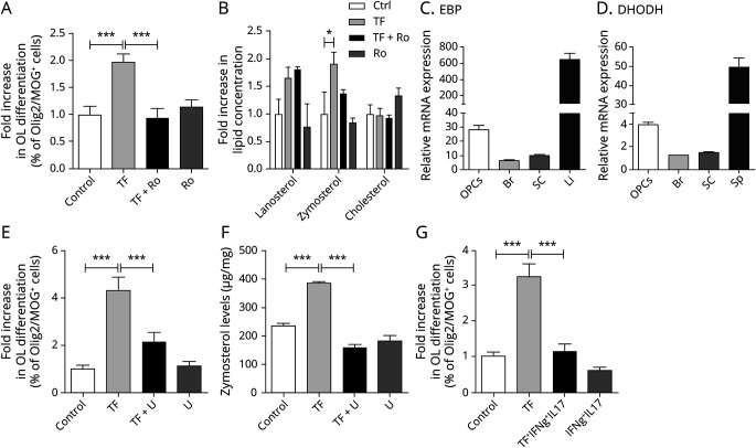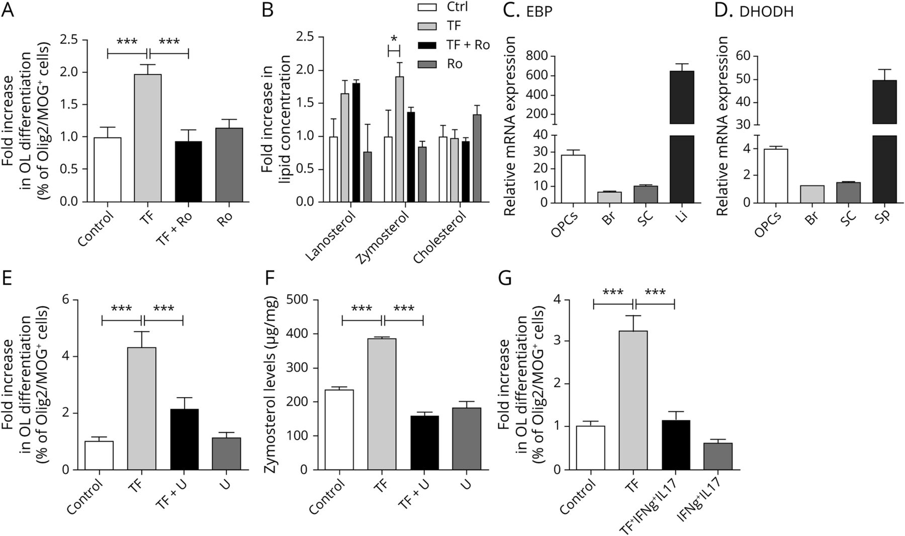 Figure 3 OPC Differentiation Induced by Teriflunomide Is Reversed by Ro 48-8071 and Associated With 8,9-Unsaturated Sterol Production (A) OPCs treated with unconditioned (Ctrl) or TF and/or Ro 48-8071 were immunostained against Olig2 and MOG at 96 hours following treatment. The percentage of Olig2+ cells coexpressing MOG was significantly increased in cultures treated with TF compared with control, an effect blocked by the Ro 48-8071 treatment. (B) Quantitation of sterol levels in OPCs treated with TF and/or Ro 48-8071. In OPC cultures treated for 24 hours with TF, the level of zymosterol was increased (results are expressed as % of controls), whereas lanosterol and cholesterol levels were unchanged. (C and D) EBP and DHODH messenger RNA levels measured by reverse transcriptase-quantitative polymerase chain reaction in OPCs, Br, and SC. The Li and Sp were used as positive control for EBP and DHODH enzymatic gene expression, respectively. Glyceraldehyde 3-phosphate dehydrogenase was used as the reference gene. (E) The percentage of MOG+/Olig2+ oligodendrocytes at 96 hours was significantly increased in OPCs treated with TF compared with control, an effect reversed by the uridine treatment. (F) Uridine blocked the accumulation of zymosterol induced by teriflunomide. (G) The percentage of MOG+/Olig2+ oligodendrocytes at 96 hours following treatment with TF and/or IFNγ/IL-17 was significantly decreased in OPCs treated with TF and exposed to IFNγ/IL-17 cytokines compared with TF. Data are shown as mean ± SEM from 3 individual experiments. *p < 0.05; ***p < 0.001 (1-way ANOVA, Newman-Keuls post hoc test). Br = brain; DHODH =dihydroorotate dehydrogenase; EBP = emopamil binding protein; Li = liver; OPC = oligodendrocyte precursor cell; SC = spinal cord; Sp = spleen; TF = teriflunomide. |
