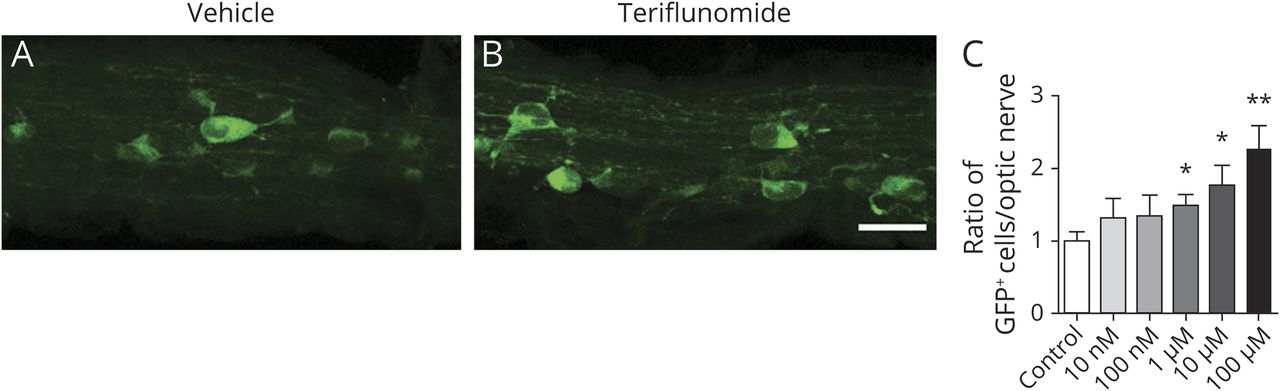 Figure 4. Effect of TF on RemyelinationDose response of remyelination potency of TF. (A and B) Detection of GFP+ oligodendroglial cells in optic nerves of stage53 Mbp:GFP-NTR tadpoles. Demyelination of stage53 Mbp:GFP-NTR tadpoles was achieved by 10 days exposure to metronidazole (10 mM) in the swimming water. Tadpoles were then returned to normal water (control) or TF for 3 days. The number of GFP+ cells in the optic nerve in control (A) is lower compared with TF-treated tadpoles (B). (C) Remyelination was assayed by counting the number of GFP+ cells per optic nerve on day 3 of the repair period. Treatment of tadpoles with TF at concentrations ranging between 1 µM and 100 µM improved remyelination up to 2.25-fold compared with spontaneous recovery (control) set as 1. Data shown are mean ± SEM, n = 5â8 tadpoles per group. *p < 0.05; **p < 0.01 (1-way ANOVA, Dunn post hoc test. Scale bar in A and B = 20 µm. MBP-GFP-NTR = myelin basic proteinâGFP-nitroreductase; TF = teriflunomide. |