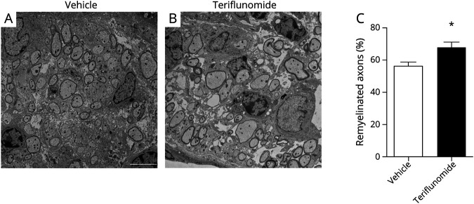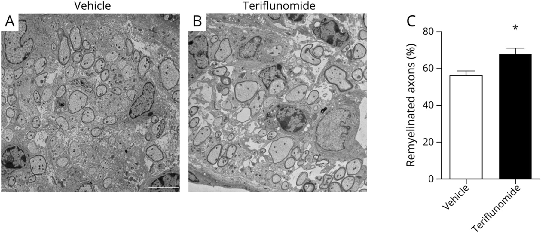 Figure 6. Effect of TF on Remyelination(A and B) Electron micrographs of the lesion area at 11 days postlesion. In control-treated mice (A) and in TF-treated mice (B). The proportion of remyelinated axons was increased in TF-treated mice. (C) The percentage of remyelinated axons is significantly increased in the lesion of TF-treated mice compared with controls. Data shown are mean ± SEM, n = 5 mice. *p < 0.05 (Student 2-tailed unpaired t test). Scale bars = 5 µm. TF = teriflunomide. |