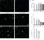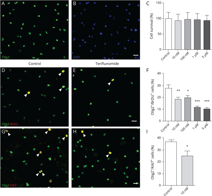 Figure 1 Effect of TF on OPC Survival and Proliferation (AâC) Immunolabeling for Olig2 (A) and nuclei staining with 4',6-diamidino-2-phenylindole (B) showing that 80% of cells are Olig2+ cells. (C) Cell survival was evaluated with MTT assay: results are expressed as % of controls and show that TF does not induce cell death at concentrations ranging between 10 nM and 5 µM. (D and E) Coimmunolabeling for Olig2 and BrDU in control (Ctrl)- (D) and TF-treated conditions (E). (F) Cell proliferation was measured as the proportion of Olig2+ cells that are also BrDU+. TF decreased the percentage of Olig2+ cells coexpressing BrDU for concentrations ranging between 10 nM and 5 µM. (G and H) Coimmunolabeling for Olig2 and Ki67 in control (Ctrl)- (G) and TF-treated conditions (H). (I) The proportion of Olig2+ cells coexpressing Ki67 was lower in the teriflunomide condition (10 nM) compared with control. White arrowheads indicate cells coexpressing the 2 markers. Data shown are mean ± SEM from 3 to 5 individual experiments. *p < 0.05; **p < 0.01; ***p < 0.001 (1-way ANOVA, Dunn post hoc test (C and F); Student 2-tailed unpaired t test (I)). Scale bar in AâF = 10 µm. BrdU = bromodeoxyuridine; TF = teriflunomide |