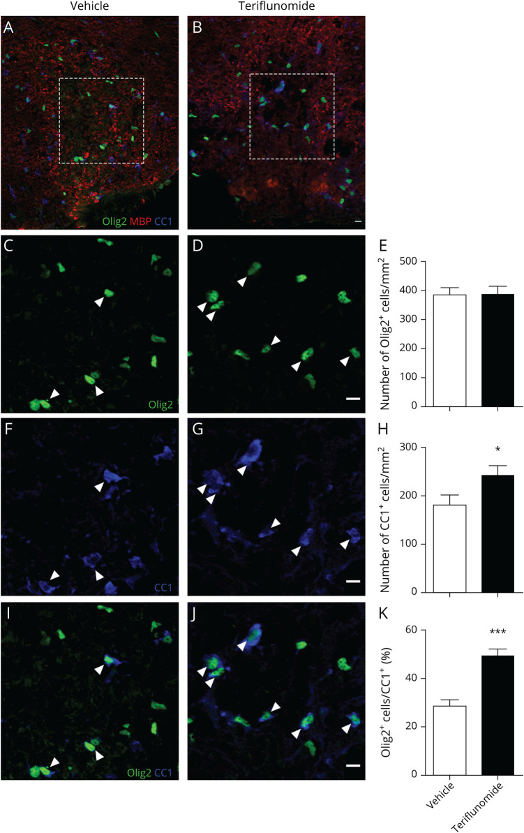 Figure 5. TF Induces Oligodendrocyte Differentiation During RemyelinationDemyelination was induced by lysophosphatidylcholine on day 0, and differentiation was assessed on day 11. (A and B) Triple immunolabeling for Olig2, MBP, and CC1 in the spinal cord lesion of control (NaCl)-treated mice (A) and TF-treated mice (B). The lesion limits are indicated by white dashed lines. (C and D) Immunolabeling for Olig2 in the core of the lesion of control (NaCl)-treated mice (C) and TF-treated mice (D). (E) No difference in the number of Olig2+cells/mm2 is observed between the groups. (F and G) Immunolabeling for CC1 in the core of the lesion of control (NaCl)-treated mice (F) and TF-treated mice (G). (H) Significantly, more CC1+ cells are present in the lesion of TF-treated mice compared with control. (I and J) Merge showing the colabeling for Olig2 and CC1. White arrowheads indicate cells coexpressing Olig2 and CC1. (K) The percentage of Olig2+ cells coexpressing CC1 is significantly increased in the lesion of TF treated mice compared with control. Data shown are mean ± SEM, n = 5 mice per group. *p < 0.05; ***p < 0.001 (Student 2-tailed unpaired t test). Scale bar = 10 µm. MBP = myelin basic protein; TF = teriflunomide. |