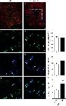 Figure 2 Effect of TF on OPC Differentiation (A and B) Newborn-derived OPCs cultures fixed at DIV 7. Coimmunolabeling for Olig2 and MOG in control (Ctrl)- (A) and TF-treated conditions (B). White arrowheads indicate cells coexpressing Olig2 and MOG. (C) A higher proportion of Olig2+ cells were coexpressing MOG when treated with TF (10 nMâ1 µM) compared with the control condition. (D and E) Adult OPCs were isolated by fluorescence-activated cell sorting from the CNS of 2 months old PDGFRa:GFP mice and immunostained for Olig2 and MOG in control (Ctrl)- (D) and TF-treated conditions (E). (F) The percentage of Olig2+ cells coexpressing MOG is significantly increased in cultures treated with TF compared to control. Data shown are mean ± SEM from 3 to 5 individual experiments. *p < 0.05; **p < 0.01; ***p < 0.001 (1-way ANOVA, Dunn post hoc test (C); Student 2-tailed unpaired t test [F]). Scale bar in AâF = 10 µm. MOG = myelin oligodendrocyte glycoprotein; OPC = oligodendrocyte precursor cell; TF = teriflunomide. |