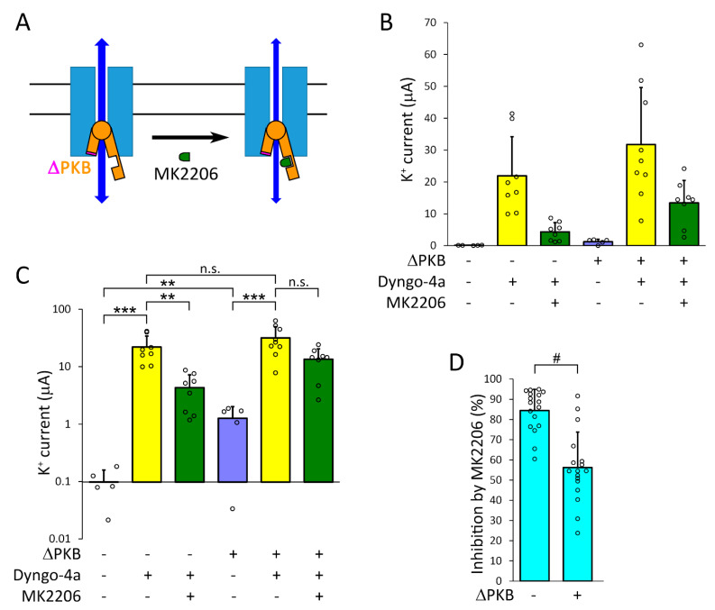 Figure 9. The coexpression of the constitutively active, PH domain deleted protein kinase B (ÎPKB) construct with TMEM175 results in small K+ currents, and reduces the MK2206-mediated inhibition of the TMEM175 current induced by dyngo-4a. (A). Schematic illustration that the degree of TMEM175 current inhibition by MK2206 is reduced, when full length protein kinase B is replaced by ÎPKB in the TMEM175-PKB protein complex. (B). The oocytes expressing TMEM175 alone, or coexpressing the channel with ÎPKB, were treated with dyngo-4a (10 μM) or dyngo-4a plus MK2206 (20 μM) for 20 h, as indicated below the graph. TMEM175 inward currents were measured in 80 mM K+ at â100 mV. (C). The same data as in panel B are plotted on a logarithmic scale to visualize the differences among the groups. Statistical analysis was performed on log-transformed data. ** p < 0.005, *** p < 0.0005 (ANOVA, Tukey HSD post hoc test), n.s.: not significant. (D). Relative inhibition of TMEM175 K+ current by MK2206 was determined in the absence or presence of ÎPKB, as indicated below the graph. The experiment illustrated in panel B was repeated in another oocyte preparation with identical results, and the data points of the currents inhibited by MK2206 (data points of the green columns) were normalized to the average current in the absence of MK2206 (yellow columns). Note that the coexpression of ÎPKB reduced the inhibition of TMEM175 current by MK2206. # p < 10â4 (MannâWhitney U-test). |