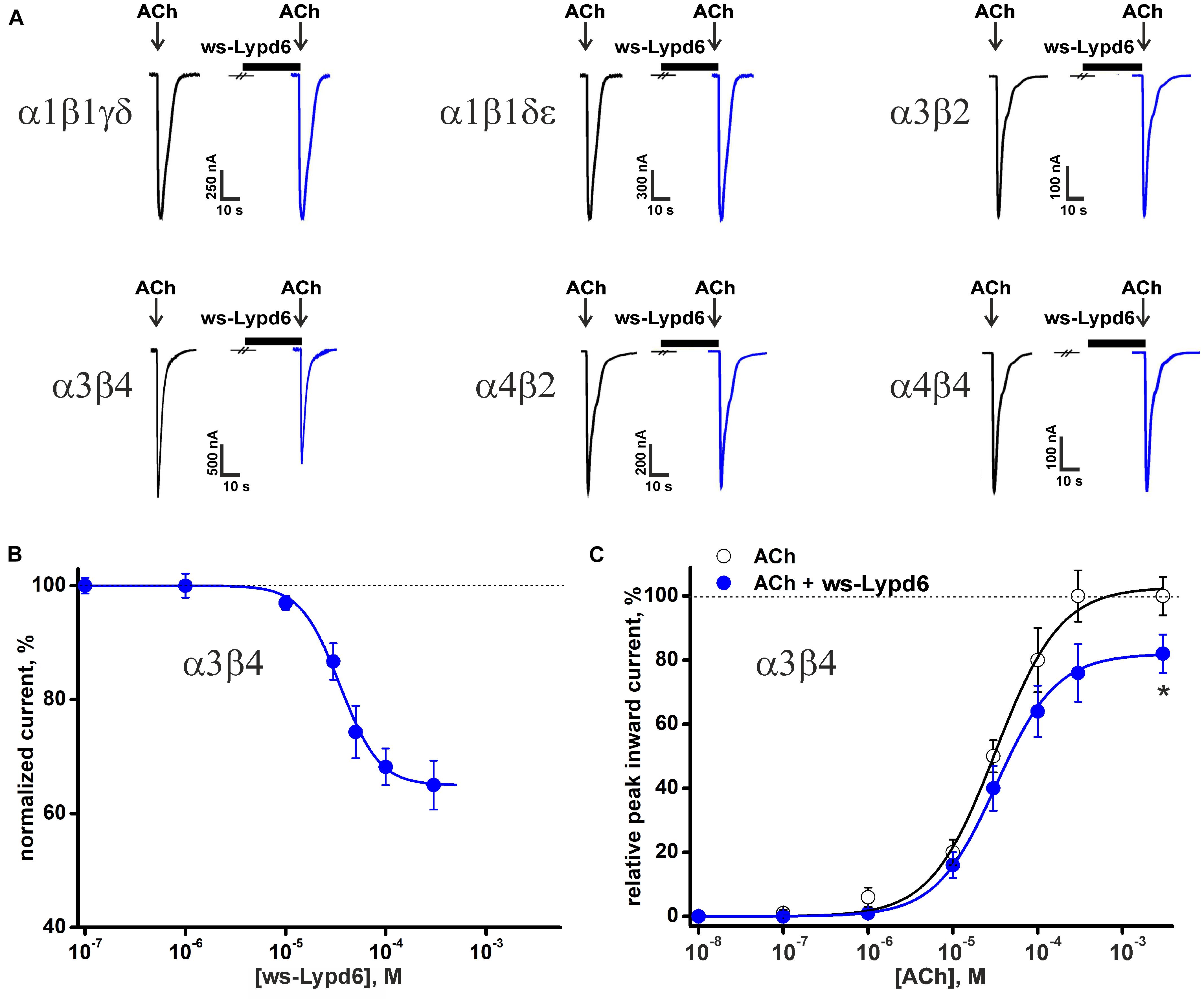 Figure 1. Effect of ws-Lypd6 on heteromeric nAChRs expressed in X. laevis oocytes. (A) Representative responses to 100 ms pulses of ACh (100 μM for α1β1γδ, α1β1δε, α3β2, α3β4; 10 μM for α4β2, and α4β4) recorded in the presence or absence of 30 μM ws-Lypd6. Pre-incubation time of oocytes with ws-Lypd6 was 5 min. (B) Dose-response curve for ws-Lypd6 inhibition of ACh-evoked currents at α3β4-nAChRs. The data are normalized to the peak amplitude of current recorded without ws-Lypd6 (100%) and presented as mean ± SEM (n = 6 oocytes). The data were fitted by the Hillâs equation resulted in IC50 for ws-Lypd6 of 34.9 ± 1.2 μM, A0 of 33 ± 5%. (C) Dose-response curves of ACh at α3β4-nAChRs in absence (open symbols) and presence of 35 μM ws-Lypd6 (closed symbols). The peak inward current amplitudes were normalized to the peak current obtained by the application of 1 mM ACh and plotted against the different concentrations of ACh applied in control. The concentration-response curve in presence of ws-Lypd6 was normalized to the control. The obtained EC50 values for ACh are 29.8 ± 4.7 μM and 31.3 ± 6.2 μM in absence and presence of ws-Lypd6, respectively. * (p < 0.05) indicates significant difference from the control value (100%, max. response for ACh without ws-Lypd6) (one sample t-test). |