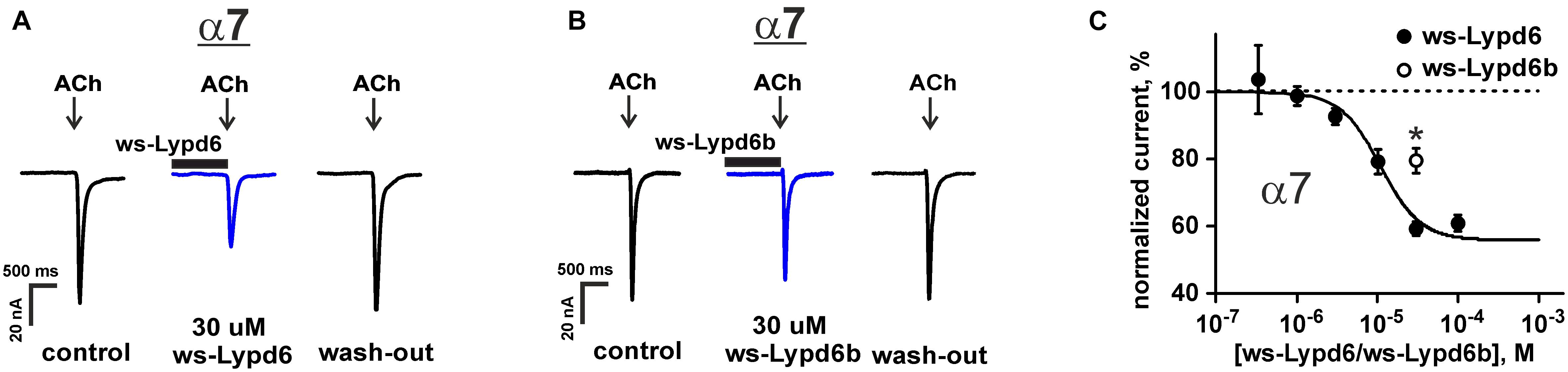 Figure 2. Ws-Lypd6 inhibits homomeric α7-nAChR expressed in X. laevis oocytes. (A,B) Representative responses to 100 ms pulses of 100 μM ACh recorded in the presence or absence of 30 μM ws-Lypd6 or ws-Lypd6b. Pre-incubation time of oocytes with ws-Lypd6 or ws-Lypd6b was 15 s. (C) Dose-response curve for the ws-Lypd6 inhibition of ACh-evoked currents at α7-nAChRs (closed symbols). The data are normalized to the peak amplitude of current recorded without ws-Lypd6 and ws-Lypd6b (100%) and presented as mean ± SEM (n = 8 oocytes from 3 animals). The data were fitted by the Hill equation resulted in IC50 for Lypd6 of 10.9 ± 1.8 μM, nH of 1.6 ± 0.4, and A0 of 46 ± 4%. Response to 30 μM ws-Lypd6b is shown by open symbol (n = 4 oocytes from 2 animals). * (p < 0.05) indicates significant difference of ws-Lypd6 and ws-Lypd6b effects (t-test). |