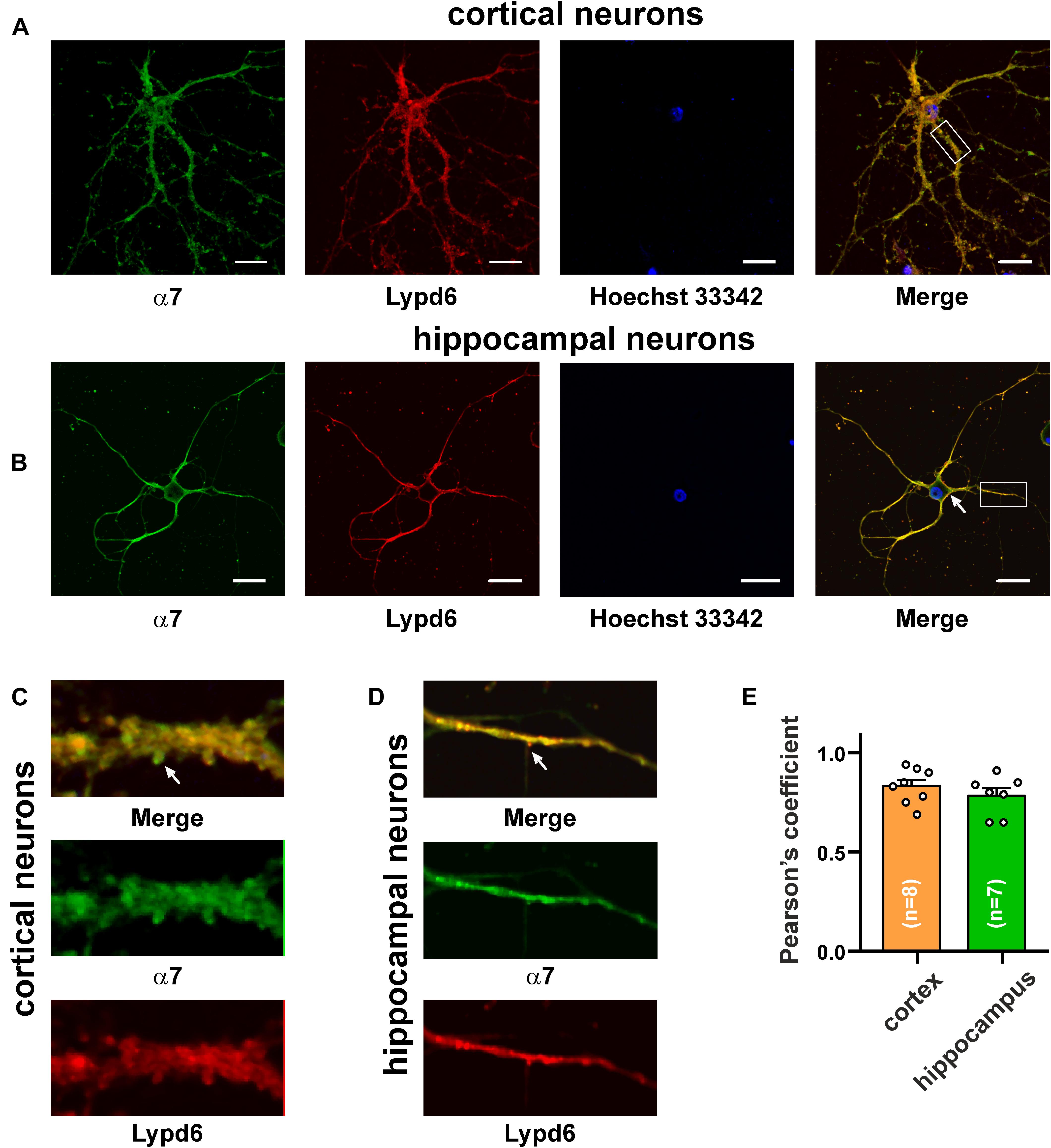 FIGURE 3. Co-localization of endogenous Lypd6 and nAChRs containing α7 subunit in primary cortical and hippocampal neurons. Cells were sequentially incubated with the mouse anti-α7/rabbit anti-Lypd6 antibodies and secondary anti-mouse Alexa-488 (green)/anti-rabbit TRITC (red) labeled antibodies, respectively. (A,C) Colocalization of Lypd6 and the α7 subunit in the cortical neurons. (B,D) Colocalization of Lypd6 and the α7 subunit in the hippocampal neurons. Scale bar 10 μm. (C,D) Enlarged fragments showed by white rectangles on (A,B), respectively. Points with the different Lypd6 and α7 expression are shown by arrows. (E) Pearson’s correlation coefficients of the Lypd6 and α7 colocalization in primary cortical and hippocampal neurons (n = 4, microphotographs). |