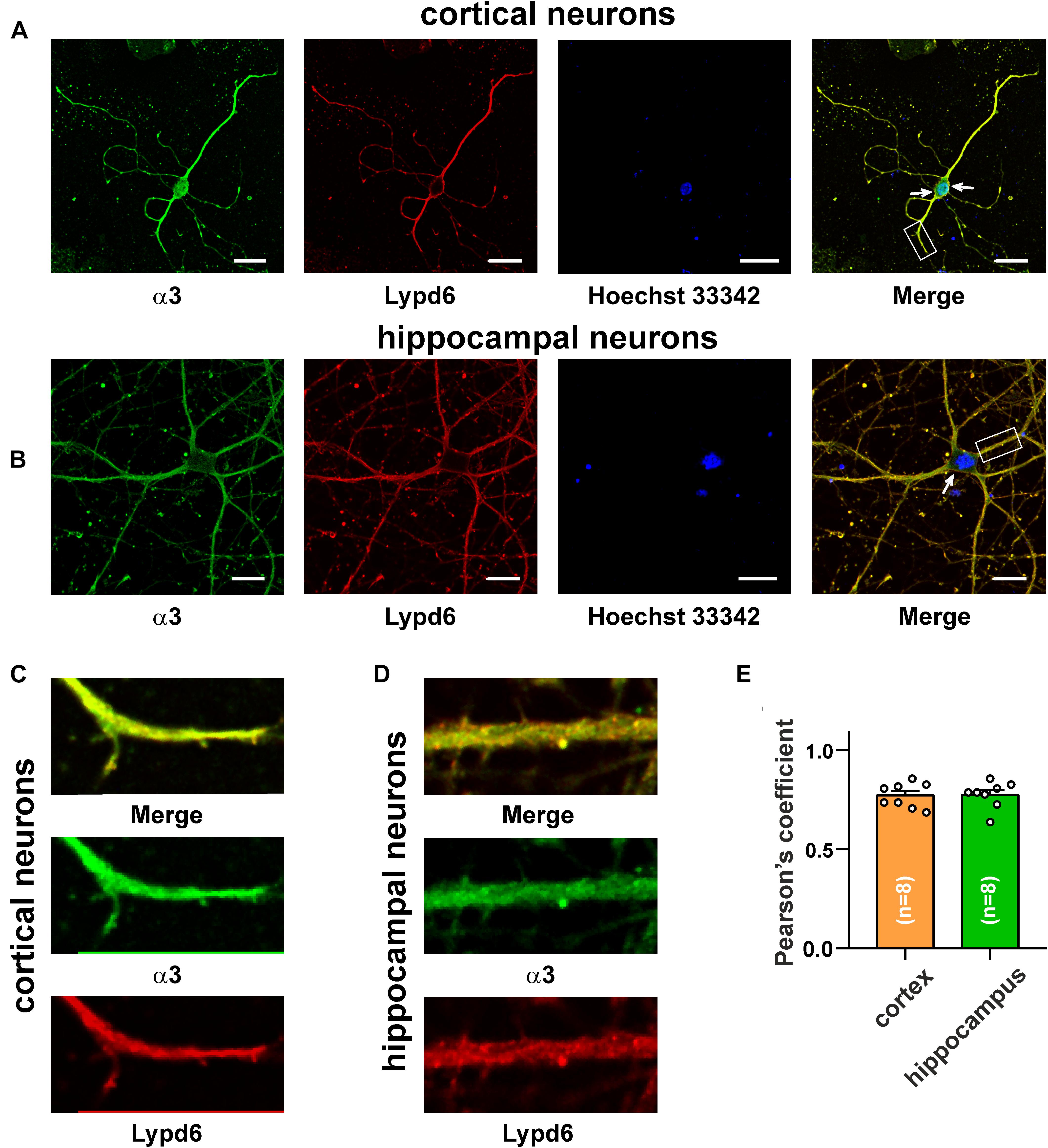 Figure 4. Co-localization of endogenous Lypd6 and nAChRs containing α3 subunit in primary cortical and hippocampal neurons. Cells were sequentially incubated with the mouse anti-α3/rabbit anti-Lypd6 antibodies and secondary anti-mouse Alexa-488 (green)/anti-rabbit TRITC (red) labeled antibodies, respectively. (A,C) Colocalization of Lypd6 and the α3 subunit in the cortical neurons. (B,D) Colocalization of Lypd6 and the α3 subunit in hippocampal neurons. Scale bar 10 μm. (C,D) Correspond to the enlarged fragments showed by white rectangles on (A,B), respectively. Points with the different Lypd6 and α3 expression are shown by arrows. (E) Pearsonâs correlation coefficients of the Lypd6 and α3 colocalization in primary cortical and hippocampal neurons (n = 4, microphotographs). |