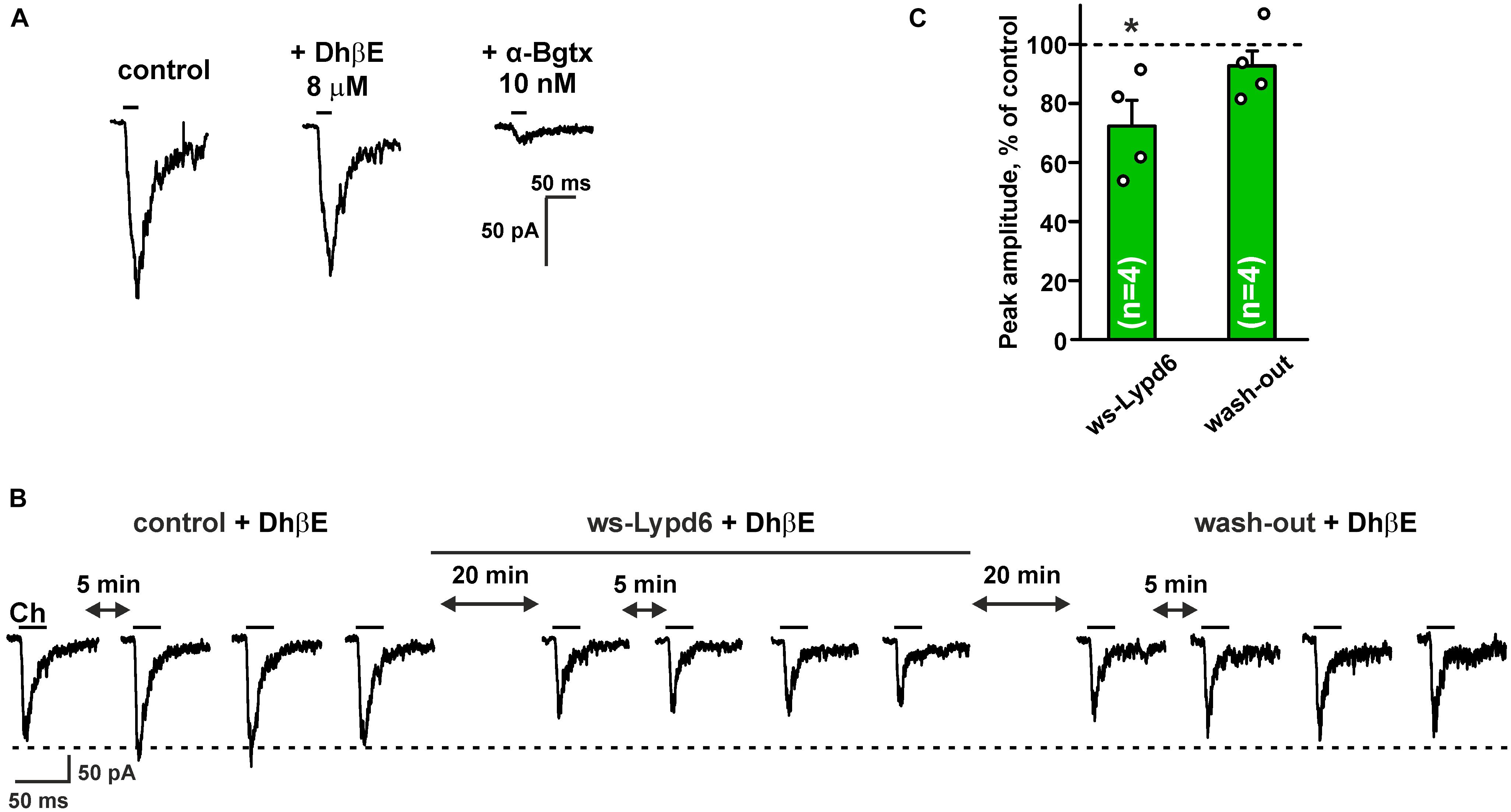 FIGURE 5. Ws-Lypd6 inhibits choline-evoked currents at nAChRs in the hippocampus. (A) Representative responses to 1 mM choline pulses in the absence and presence of 8 μM DhβE or 10 nM α-Bgtx. (B) Representative responses to 25 ms pulses of 1 mM choline (Ch) recorded in one cell in the absence and presence of 1 μM ws-Lypd6. (C) Peak amplitude of the choline-evoked currents in the presence of 1 μM ws-Lypd6 and after wash-out recorded in four different cells taken from different animals (n = 4 slices, four rats). Four responses (like shown in B) were averaged for each slice and normalized to the average control amplitude (100%, shown by dotted line). The data are presented as mean ± SEM. * (p < 0.05) indicates significant difference from the control value (t-test). Experiments in (B,C) were performed in presence of 8 μM DhβE. |