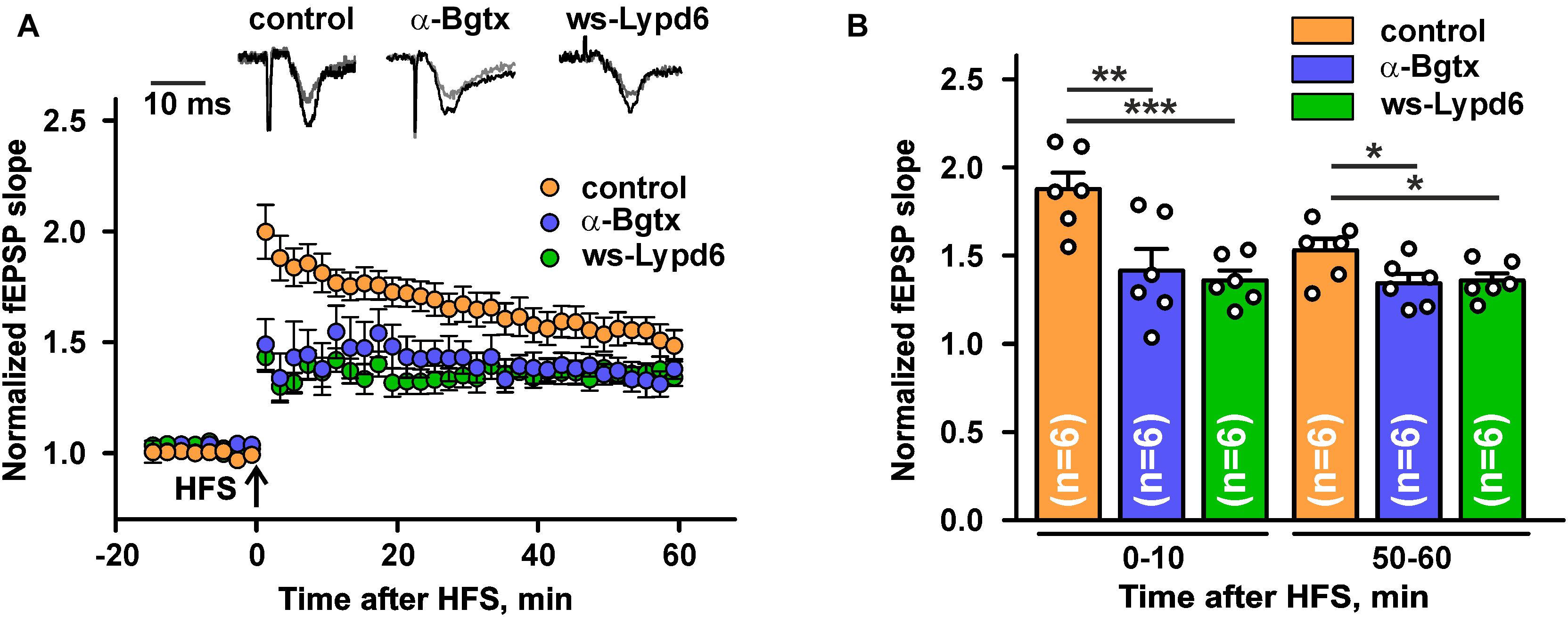 Figure 6. Ws-Lypd6 suppresses long-term potentiation (LTP) in the mice hippocampal slices. (A) Averaged 1 h LTP responses in hippocampal slices after 1 h preincubation in ACSF containing 1 μM ws-Lypd6 or 10 nM α-Bgtx (in each case n = 6 slices, six mice). The same compounds were present in ACSF during recording. Representative normalized fEPSP traces are shown above: grayâbaseline, blackâpost-tetanic recording. (B) Normalized fEPSP slopes averaged over 0â10 and 50â60 min after HFS. The data are presented as mean ± SEM. * (p < 0.05), ** (p < 0.01), and *** (p < 0.001) indicate significant difference (t-test). |
