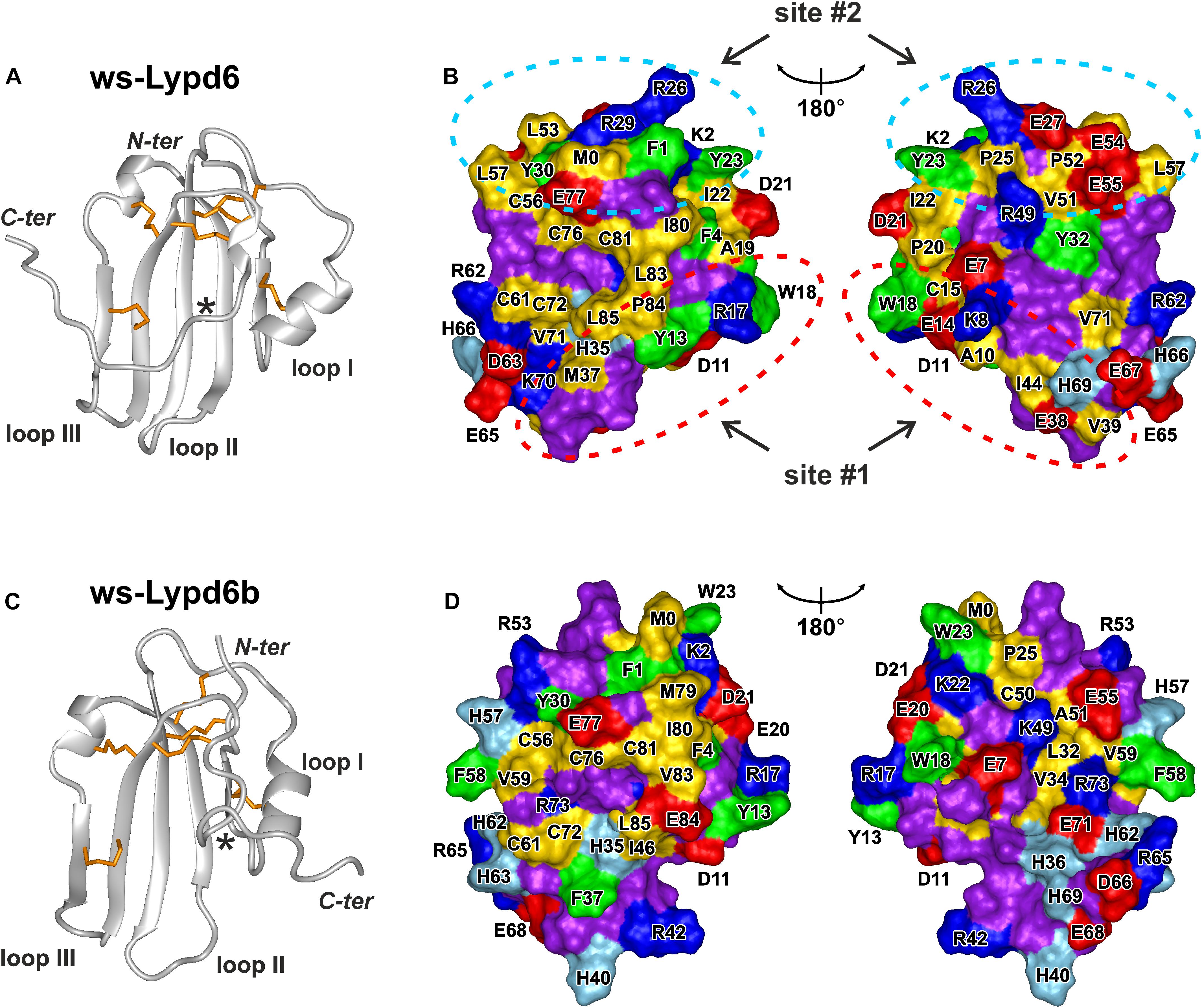 Figure 7. Spatial structures and molecular surfaces of ws-Lypd6 (A,B) and Lypd6b (C,D). (A,C) The disulfide bonds are in orange. Only one conformation of the flexible C-terminal âtailâ is shown for each protein. The C-termini of the structured LU-domains (Leu85) are marked with asterisks. (B,D) Two-sided view of the molecular surfaces. Only LU-domains without C-tails (terminated at Leu85) are shown. The hydrophobic (Ala, Met, Ile, Leu, Val, Cys, and Pro), aromatic (Phe, Trp, Tyr), polar (Asn, Gln, Gly, Ser, and Thr), positively charged (Arg and Lys), negatively charged (Asp and Glu), and His residues are colored in yellow, green, violet, blue, red, and cyan, respectively. Two possible receptor-binding sites responsible for the Lypd6 interaction with nAChRs are highlighted by dashed ellipses. Orientation of the molecular surfaces in the left parts of the panels (B,D) is identical to the molecules orientation in (A,C) PDB codes: ws-Lypd6â6IB6, ws-Lypd6Bâ6ZSO (Paramonov et al., 2020). |
