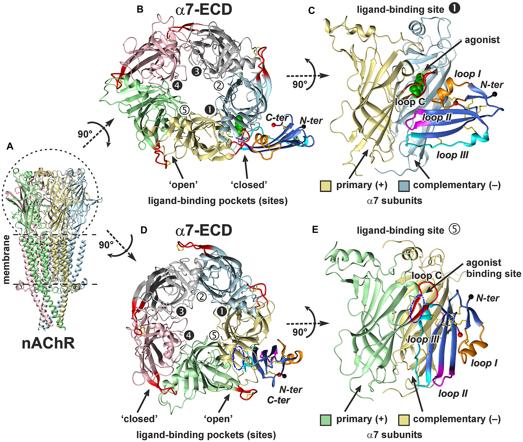 FIGURE 8. In silico modeling of the α7-ECD/ws-Lypd6 complex. (A) General view of homopentameric nAChR in the membrane. For clarity, the subunits are colored differently. (B,D) The top view on α7-ECD with the bound ws-Lypd6 molecules. Ligand-binding sites of the receptor have different conformations of the loop C. In the sites 1, 3, and 4 the ligand-binding pockets are “closed” by the loop C, while in the sites 2 and 5 the ligand-binding pockets are “open”. (C,E) The side view on the ligand-binding sites 1 and 5 of α7-ECD. Each binding site is formed at the interface between the primary (+) and complementary (–) α7 subunits. (B,C) Representative solution, where ws-Lypd6 contacts the “closed” α7-nAChR binding site with the loops I, II and III (complex #1, Supplementary Table 1). For clarity, the agonist (epibatidine) molecule (green spheres) is placed into the orthosteric ligand-binding site according to PDB id 3SQ6. (D,E) Representative solution, where ws-Lypd6 interacts with the “open” α7-nAChR binding site by the “head” and loop III (complex #2, Supplementary Table 1). The putative position of an agonist in the orthosteric binding site is shown by blue dashed-dot ellipses. C loop of the primary α7 subunit and ws-Lypd6 loops are shown by red and orange/magenta/blue colors, respectively. Disulfide bonds are in yellow. N- and C-termini of the Lypd6 LU-domain are shown with black and red spheres, respectively. The “favorable” contacts observed in the complexes are listed in Supplementary Table 1. |