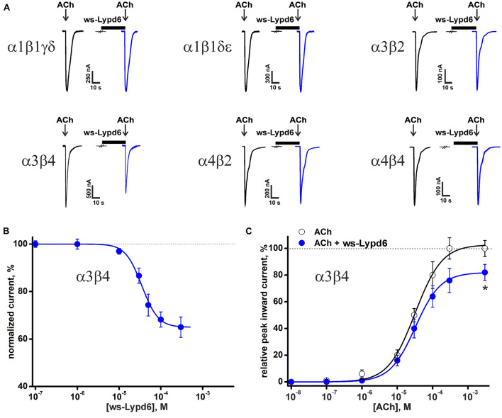 FIGURE 1. Effect of ws-Lypd6 on heteromeric nAChRs expressed in X. laevis oocytes. (A) Representative responses to 100 ms pulses of ACh (100 μM for α1β1γδ, α1β1δε, α3β2, α3β4; 10 μM for α4β2, and α4β4) recorded in the presence or absence of 30 μM ws-Lypd6. Pre-incubation time of oocytes with ws-Lypd6 was 5 min. (B) Dose-response curve for ws-Lypd6 inhibition of ACh-evoked currents at α3β4-nAChRs. The data are normalized to the peak amplitude of current recorded without ws-Lypd6 (100%) and presented as mean ± SEM (n = 6 oocytes). The data were fitted by the Hill’s equation resulted in IC50 for ws-Lypd6 of 34.9 ± 1.2 μM, A0 of 33 ± 5%. (C) Dose-response curves of ACh at α3β4-nAChRs in absence (open symbols) and presence of 35 μM ws-Lypd6 (closed symbols). The peak inward current amplitudes were normalized to the peak current obtained by the application of 1 mM ACh and plotted against the different concentrations of ACh applied in control. The concentration-response curve in presence of ws-Lypd6 was normalized to the control. The obtained EC50 values for ACh are 29.8 ± 4.7 μM and 31.3 ± 6.2 μM in absence and presence of ws-Lypd6, respectively. * (p < 0.05) indicates significant difference from the control value (100%, max. response for ACh without ws-Lypd6) (one sample t-test). |
