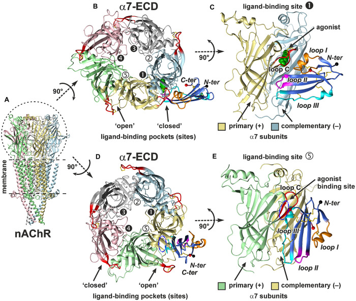 Figure 8. In silico modeling of the α7-ECD/ws-Lypd6 complex. (A) General view of homopentameric nAChR in the membrane. For clarity, the subunits are colored differently. (B,D) The top view on α7-ECD with the bound ws-Lypd6 molecules. Ligand-binding sites of the receptor have different conformations of the loop C. In the sites 1, 3, and 4 the ligand-binding pockets are âclosedâ by the loop C, while in the sites 2 and 5 the ligand-binding pockets are âopenâ. (C,E) The side view on the ligand-binding sites 1 and 5 of α7-ECD. Each binding site is formed at the interface between the primary (+) and complementary (â) α7 subunits. (B,C) Representative solution, where ws-Lypd6 contacts the âclosedâ α7-nAChR binding site with the loops I, II and III (complex #1, Supplementary Table 1). For clarity, the agonist (epibatidine) molecule (green spheres) is placed into the orthosteric ligand-binding site according to PDB id 3SQ6. (D,E) Representative solution, where ws-Lypd6 interacts with the âopenâ α7-nAChR binding site by the âheadâ and loop III (complex #2, Supplementary Table 1). The putative position of an agonist in the orthosteric binding site is shown by blue dashed-dot ellipses. C loop of the primary α7 subunit and ws-Lypd6 loops are shown by red and orange/magenta/blue colors, respectively. Disulfide bonds are in yellow. N- and C-termini of the Lypd6 LU-domain are shown with black and red spheres, respectively. The âfavorableâ contacts observed in the complexes are listed in Supplementary Table 1. |