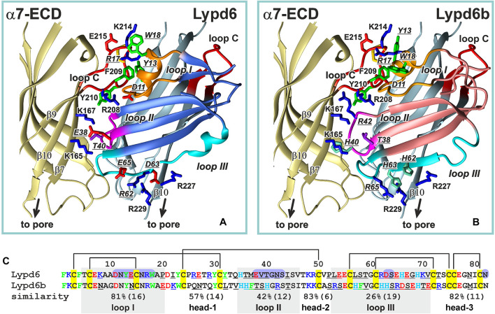 FIGURE 9. Comparison of the ws-Lypd6 and ws-Lypd6b amino acid sequences and their possible complexes with α7-ECD. (A) The “favorable” contacts in the α7-ECD/ws-Lypd6 complex (Figure 8C). The sidechains participating in the electrostatic and hydrophobic interactions are shown. (B) The possible structure of the α7-ECD/ws-Lypd6b complex. The ws-Lypd6b molecule is shown in the same orientation as ws-Lypd6 molecule in (A). Ws-Lypd6b cannot form as many “favorable” contacts with the receptor as ws-Lypd6. (C) Sequence alignment of the LU-domains of ws-Lypd6 and ws-Lypd6b. The similarity (%) is independently shown for each region of the proteins. The total number of residues in the loops is given in brackets. The differing residues are underlined. The aromatic (Phe, Trp, Tyr), positively charged (Arg and Lys), negatively charged (Asp and Glu), and His residues are colored in green, blue, red, and cyan, respectively. The residues of ws-Lypd6 forming contacts with α7-ECD in the proposed model are highlighted by violet background. |